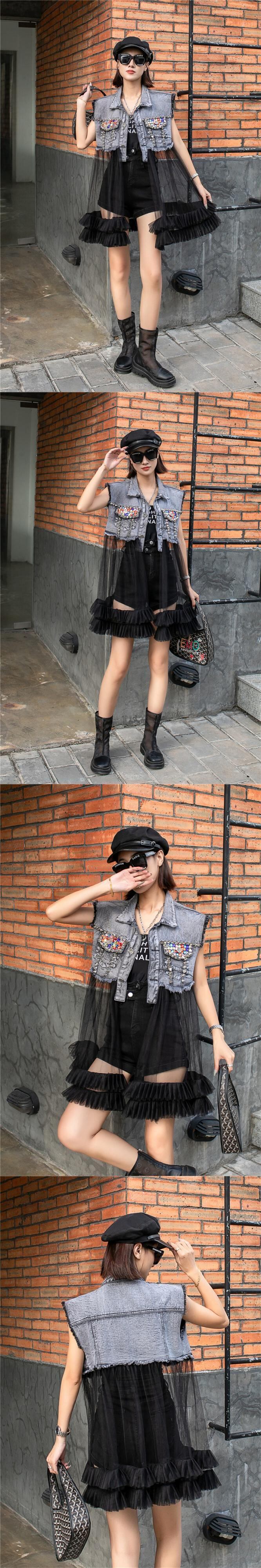 【EWQ】デニムパネル ノースリーブ ベスト トレンド ダークグレー メッシュ トップス リベット スパンコール ターンダウンカラー ジャケット 夏 16Y3434 サマー 夏物