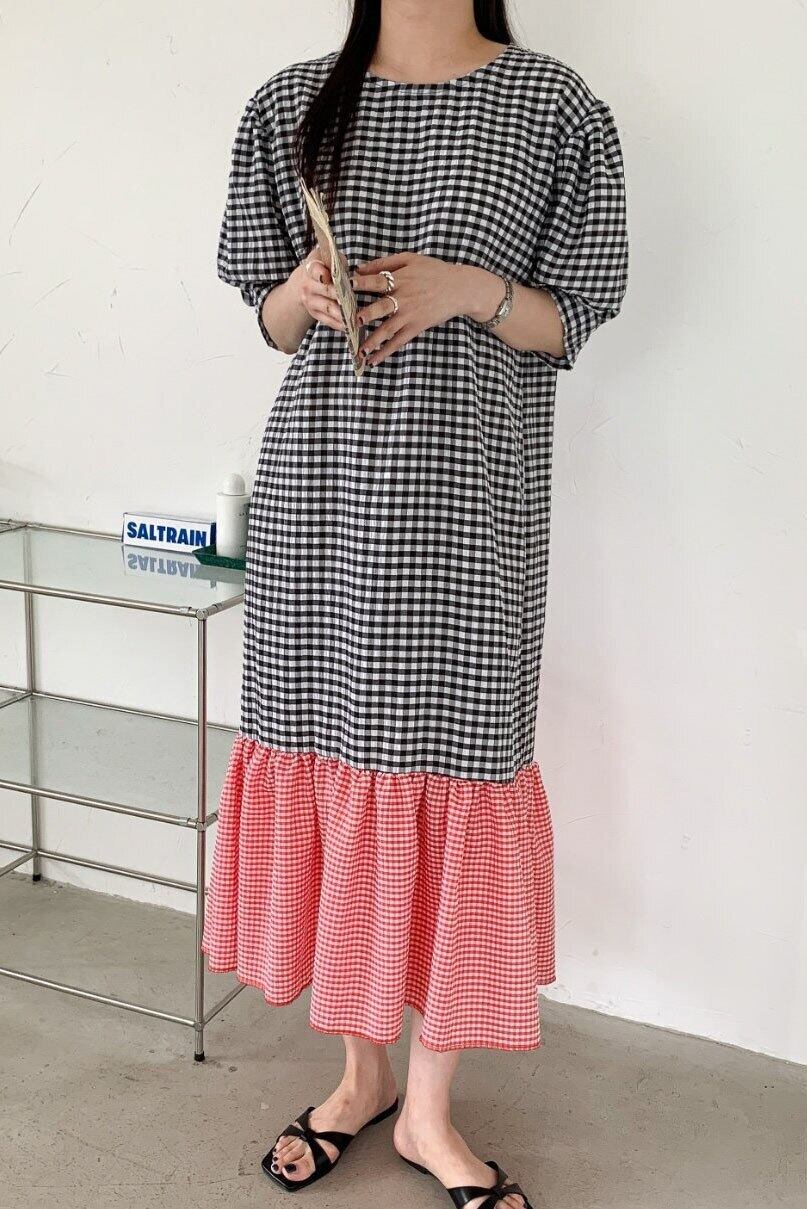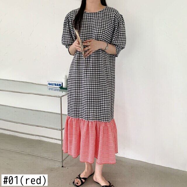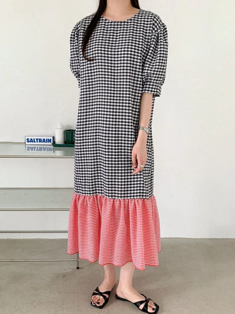 [EWQ] チェック柄カラー コントラスト フリル スプライス ドレス パッチワーク パフ スリーブ ドレス春夏 Vestido スプリング 春物 サマー 夏物