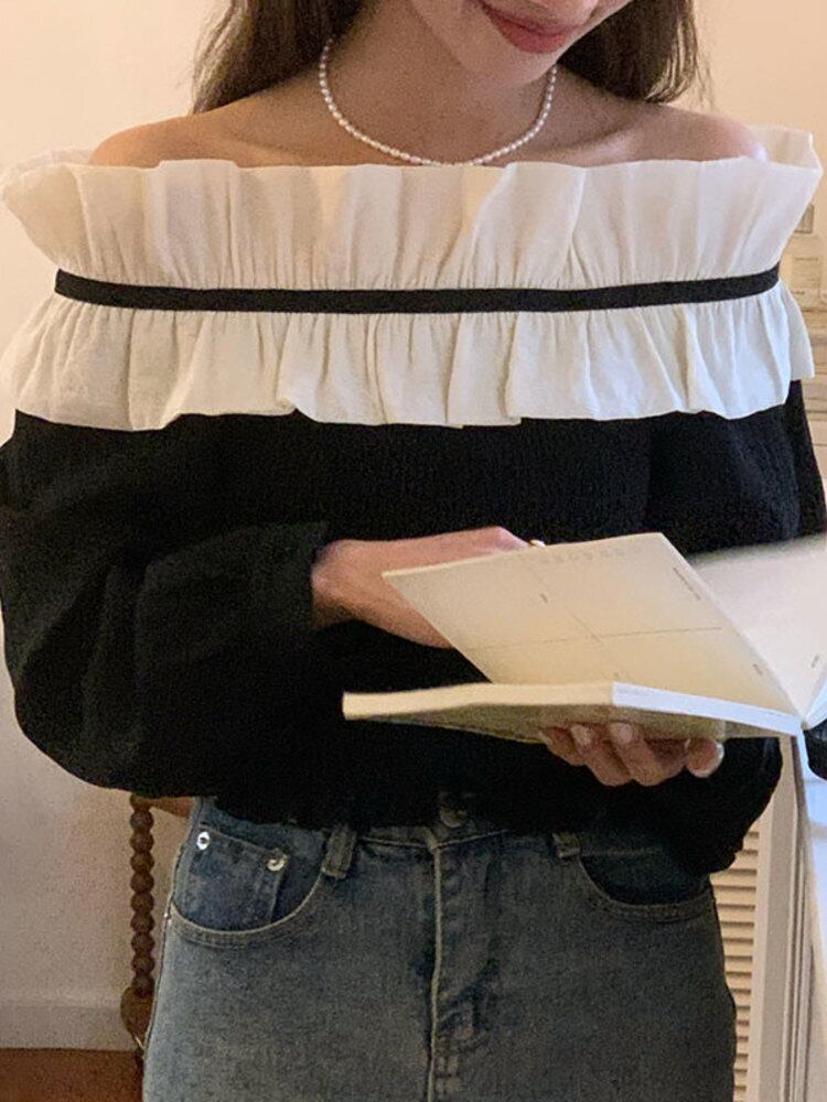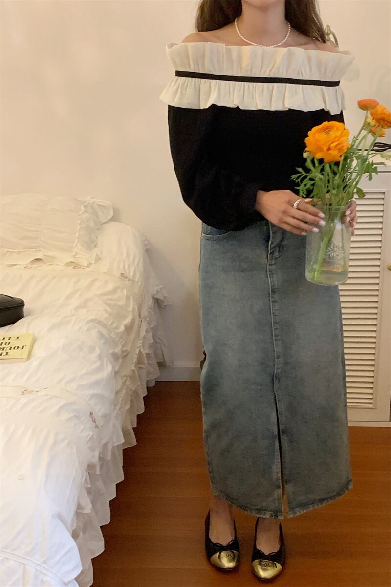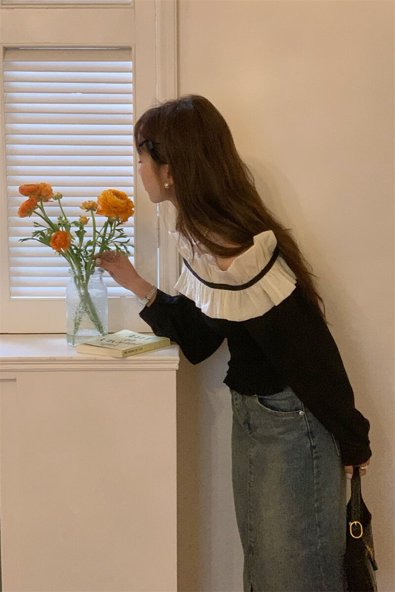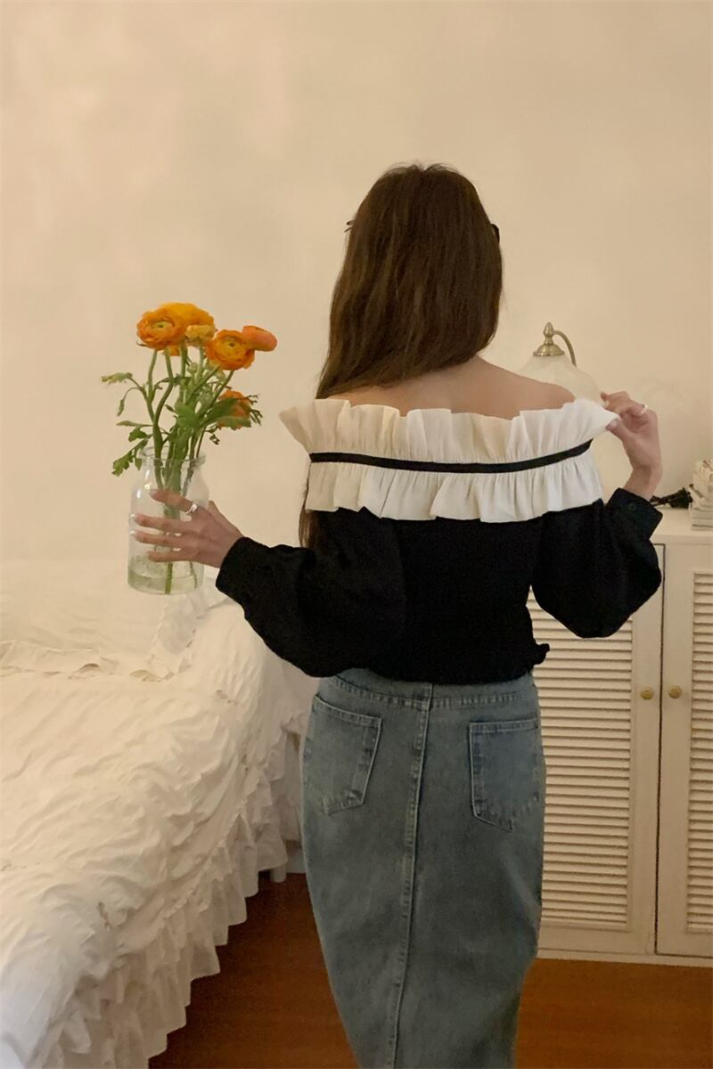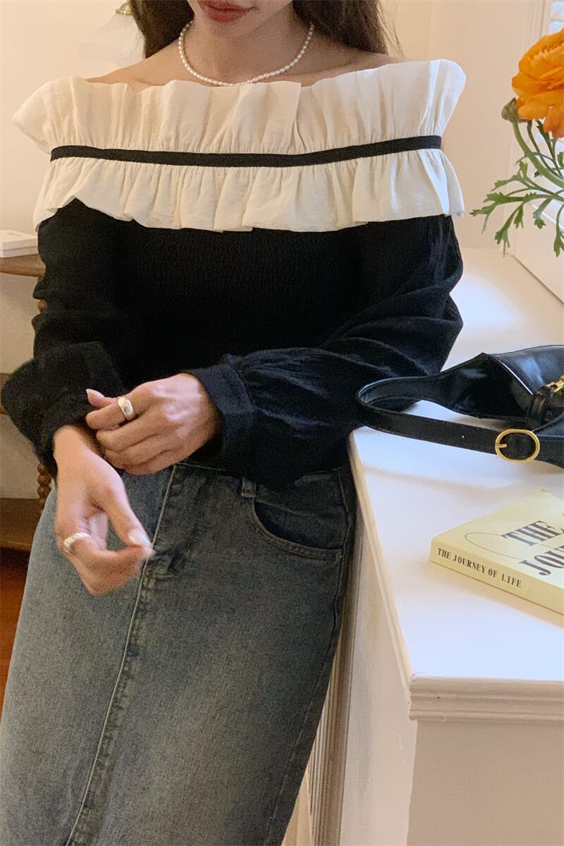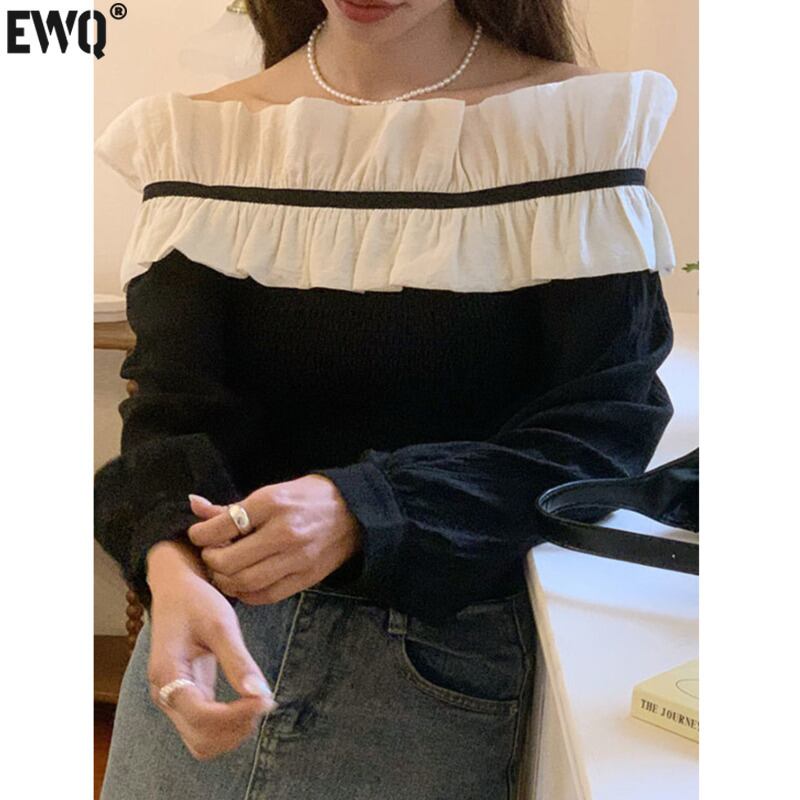 [EWQ] レディース オフショルダー コントラスト シャツ フリル スプライシング スラッシュ ネック トップ 春夏シャツ Y6797 スプリング 春物 サマー 夏物
