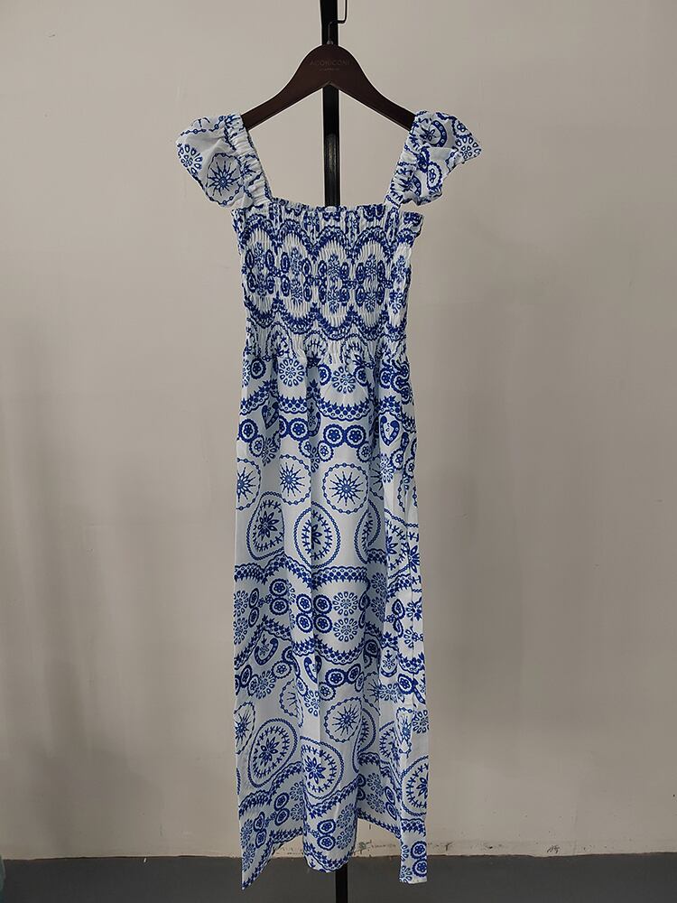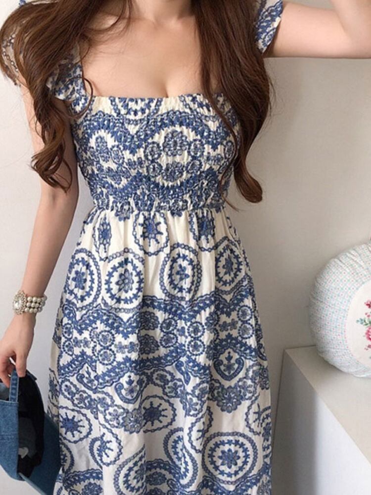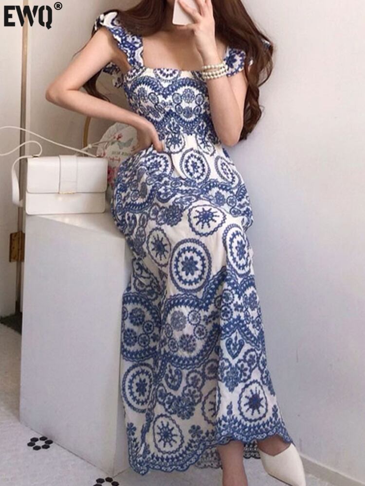 [EWQ] レトロ ボヘミアン スタイル シック スクエア ネック ウエスト クロージング フライング スリーブ ドレス Vestidos 夏 16Y392 サマー 夏物 スクウェア
