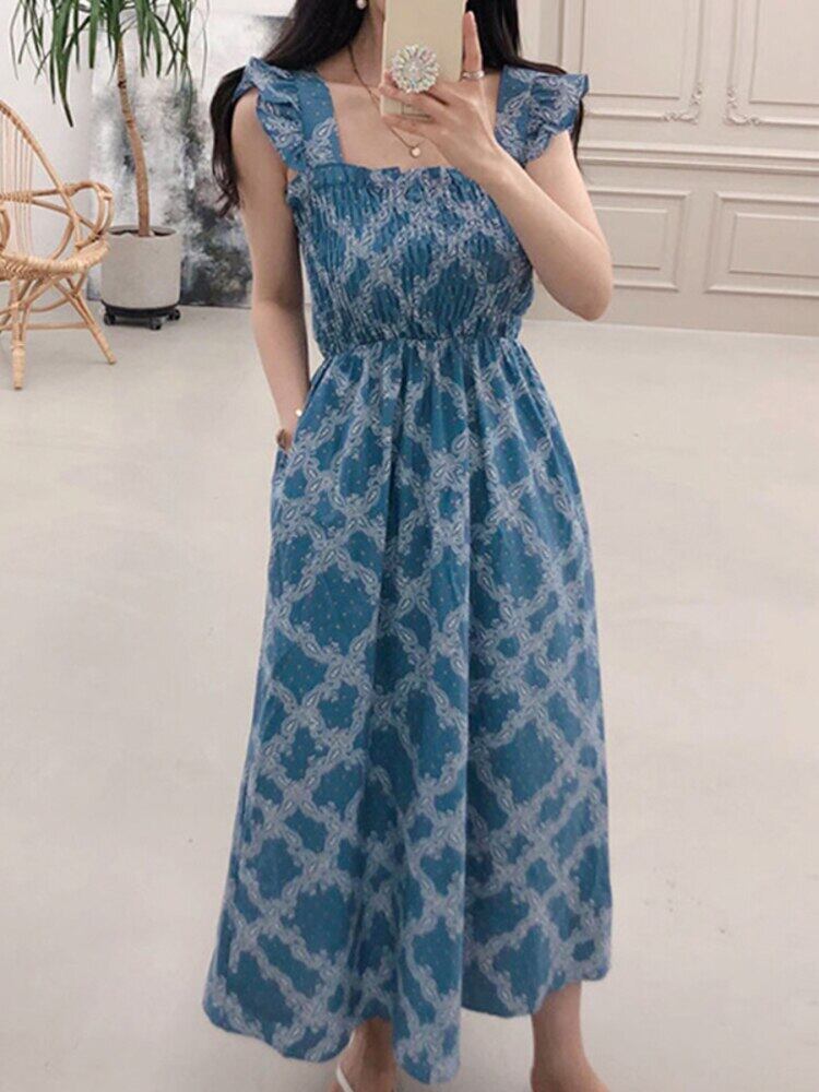[EWQ] スクエア ネック プリント ドレス プリーツ ウエスト弾性コントラスト ドレス夏潮 Vestidos 16Y8416 エラスティック 伸縮 サマー 夏物 スクウェア