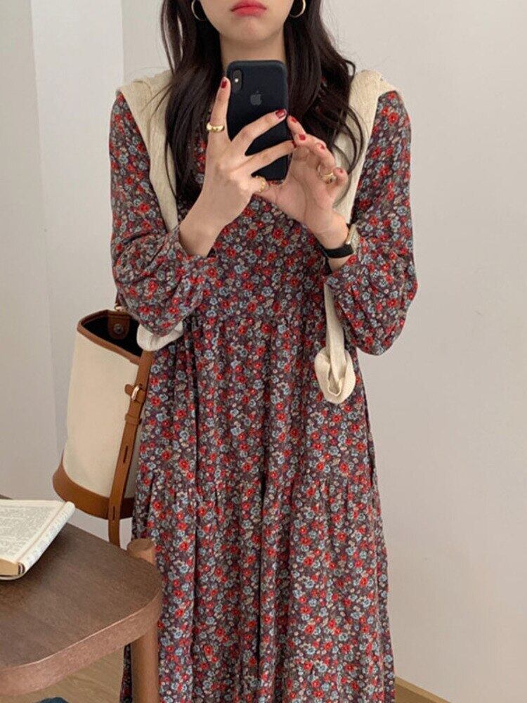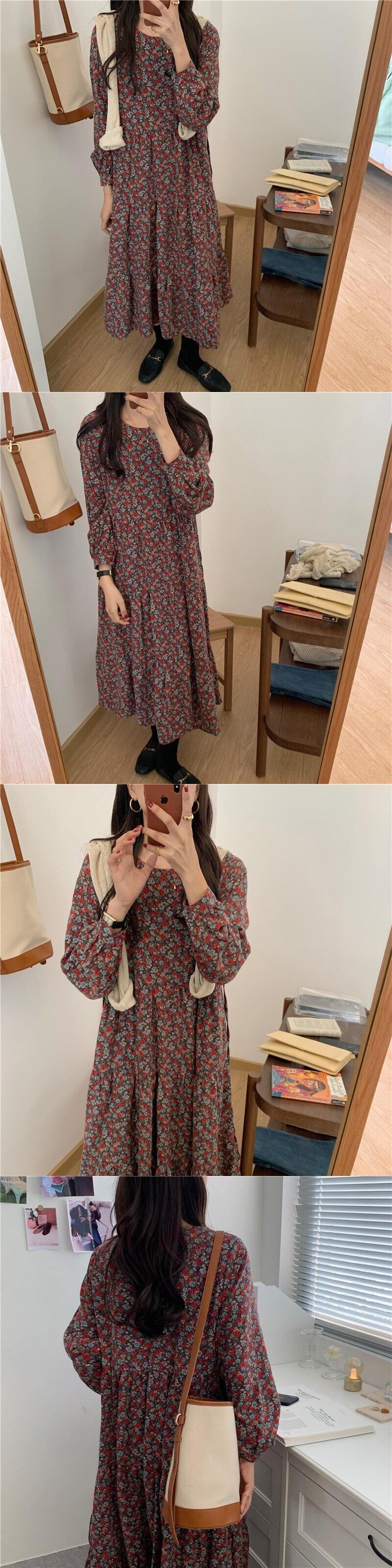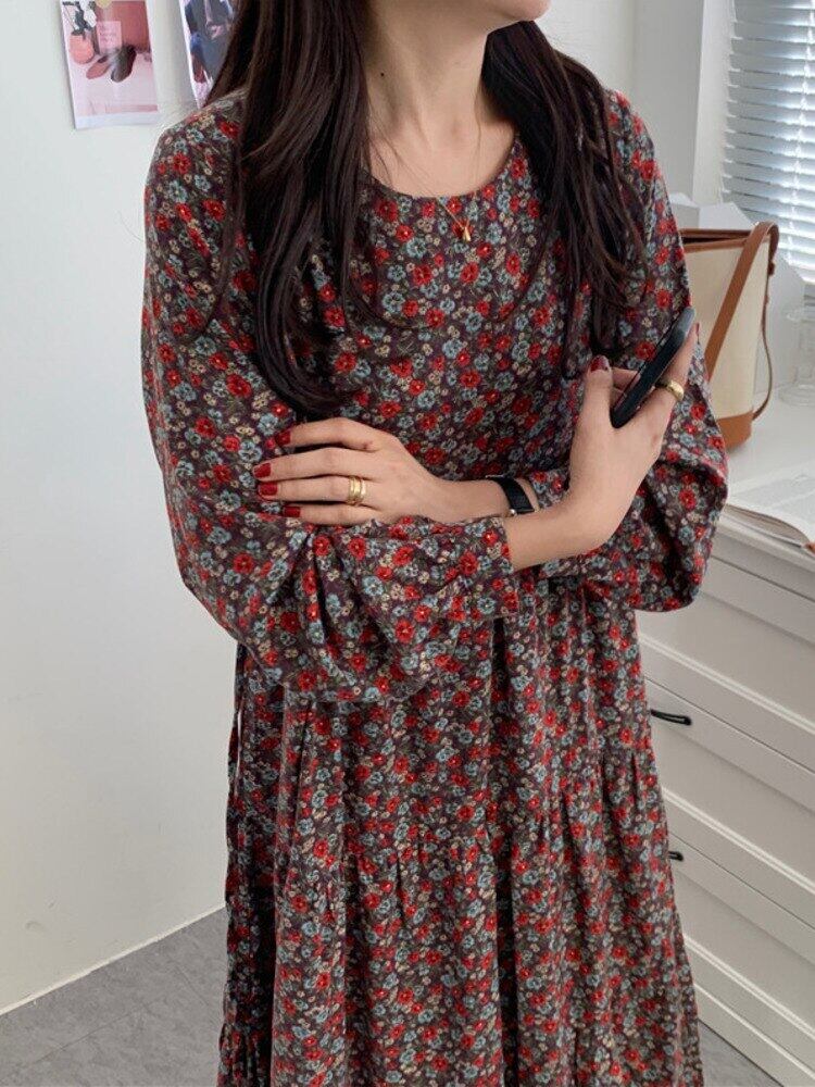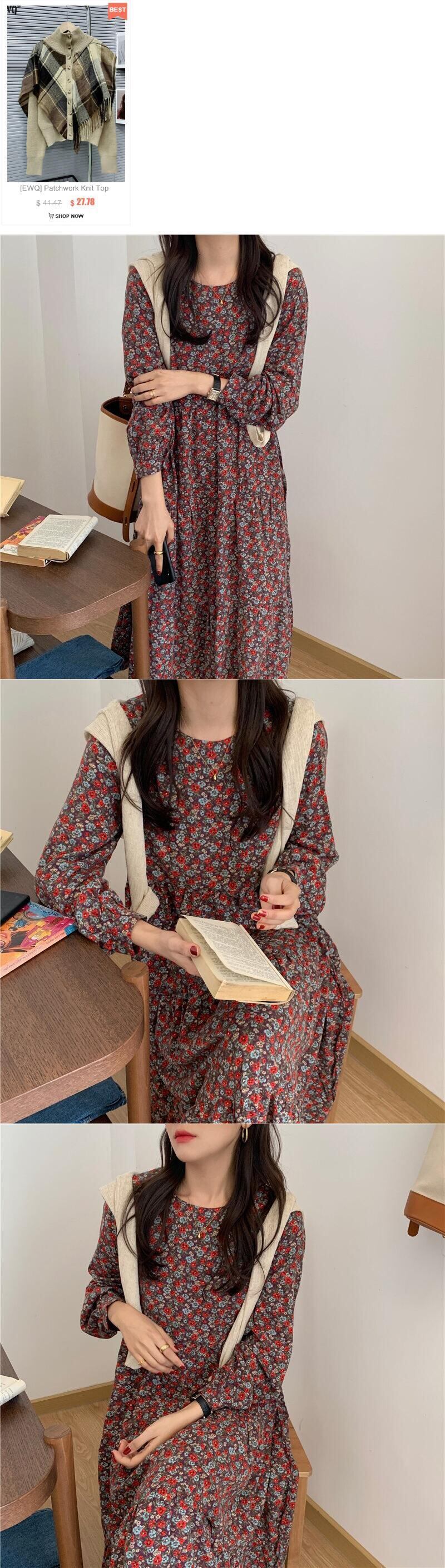 【EWQ】レディース 長袖 Oネック Aライン ワンピース 春 秋 シック 配色 コントラスト プリント ワンピース 16Y569 ロング スプリング 春物 オータム 秋物 ドレス