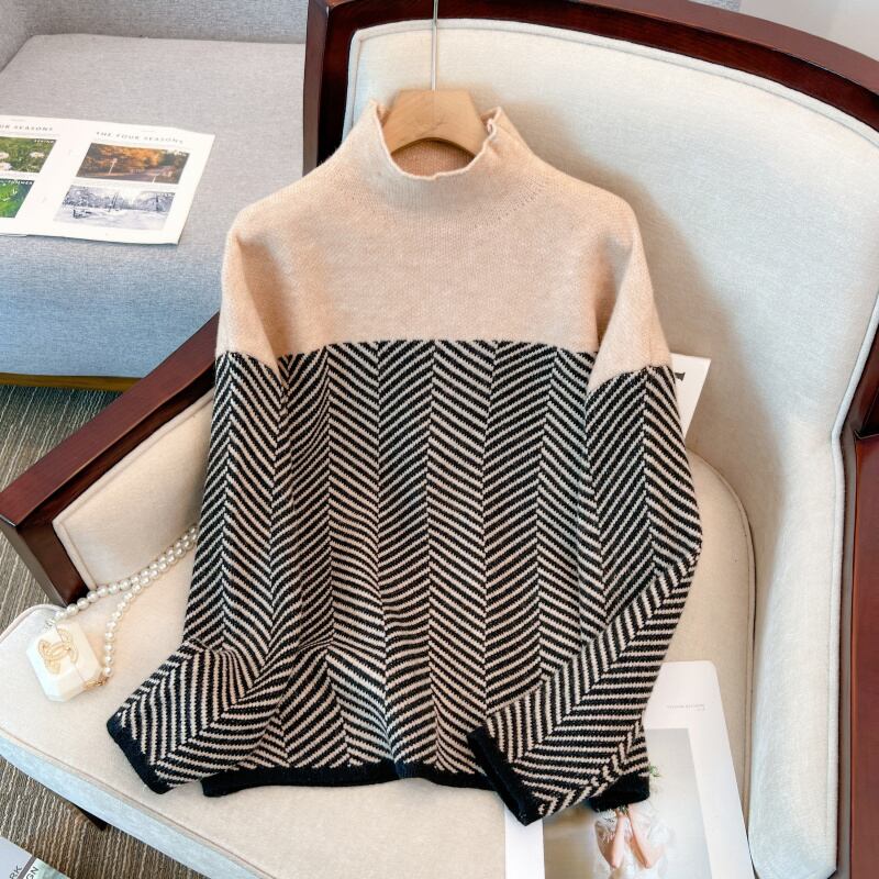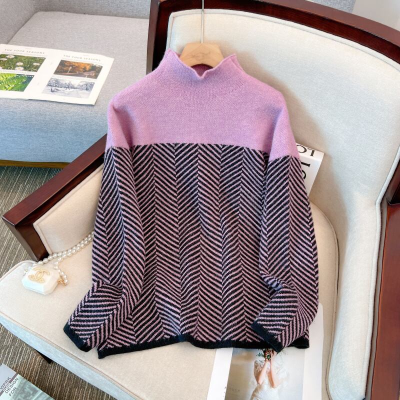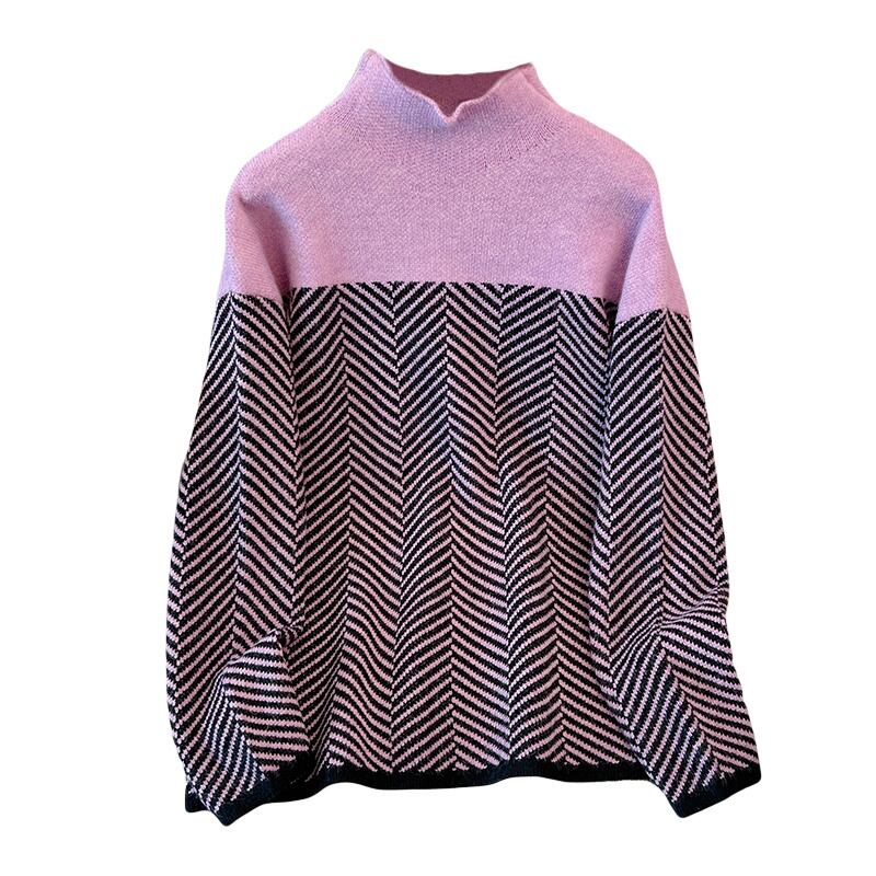 【EWQ】長袖 コントラストカラー レディース ウォームパープル セーター 春秋トレンド ストライプ プルオーバー ニット ロング スプリング 春物 オータム 秋物