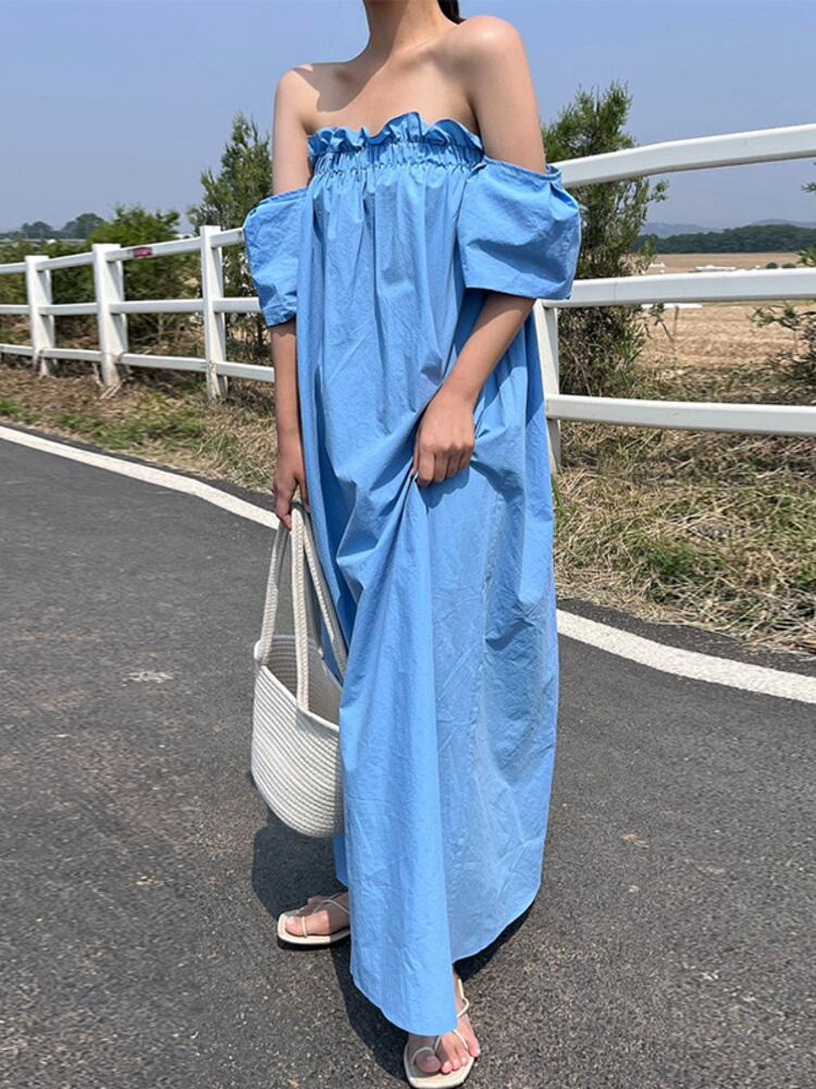 [EWQ] ホリデードレスオフショルダールーズパフスリーブ無地フリルスプライスドレス夏 Vestido 8124 サマー 夏物 ソリッドカラー