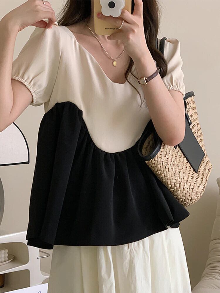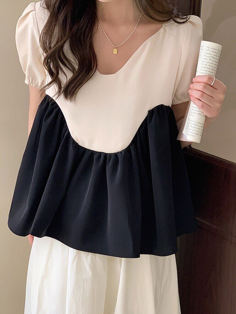 [EWQ] V ネック シャツ不規則スプライス コントラスト パフ スリーブ ブラウス トップ夏潮パッチワーク カジュアル トップス 423 サマー 夏物 Vネック