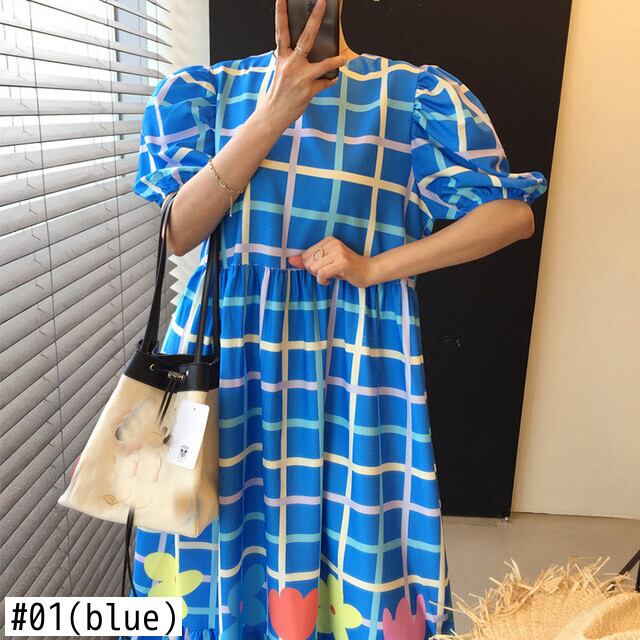 [EWQ] 花チェック柄ドレス コントラスト カラー O ネック パフ スリーブ ルーズ カジュアル ドレス夏潮 Vestido 16Y8398 サマー 夏物 Oネック フラワーデザイン
