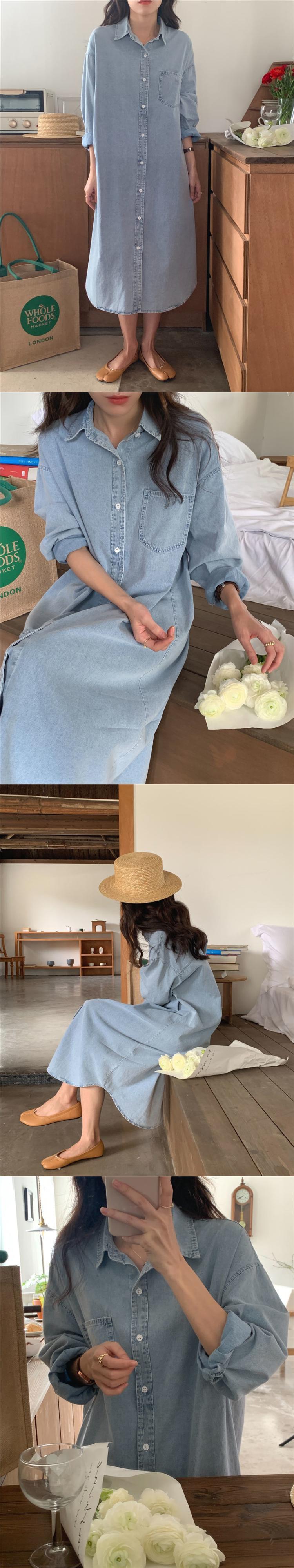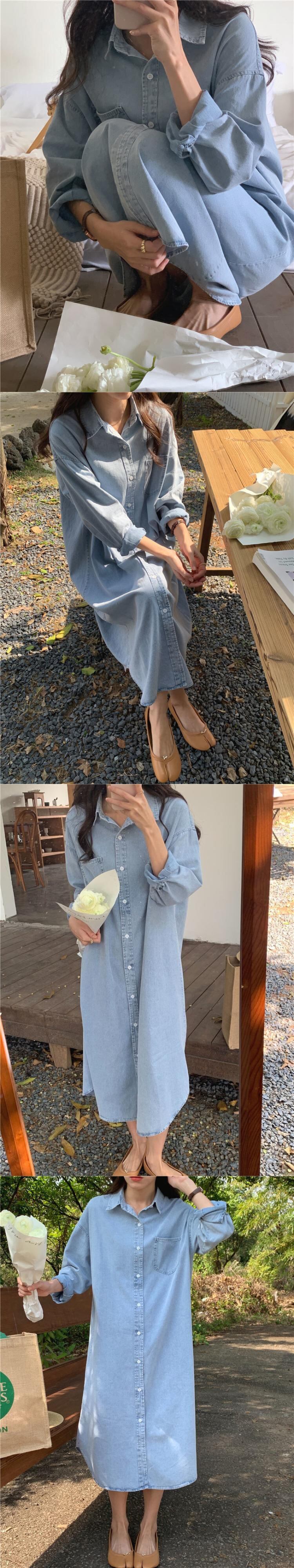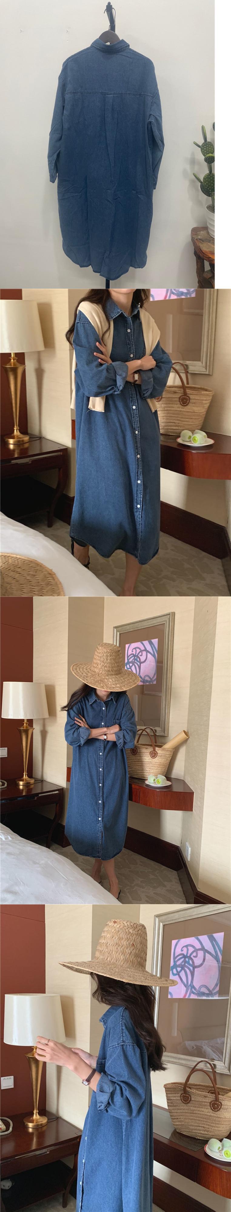 【EWQ】シンプルラペル シングルブレスト 無地 ゆったり シャツワンピース 長袖 デニムワンピース サマースタイル 16Y523 ロング 夏物 ドレス ソリッドカラー