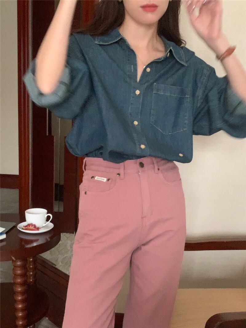 [EWQ] ラペルデニムシャツ長袖シングルブレストブラウスポケットトップ春秋潮トップス 7881 ロング スプリング 春物 オータム 秋物