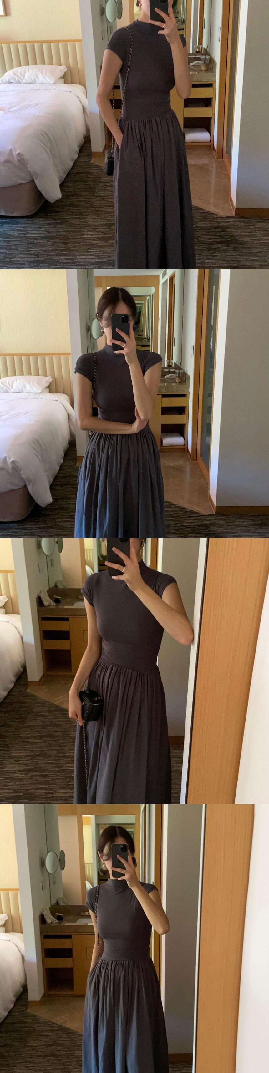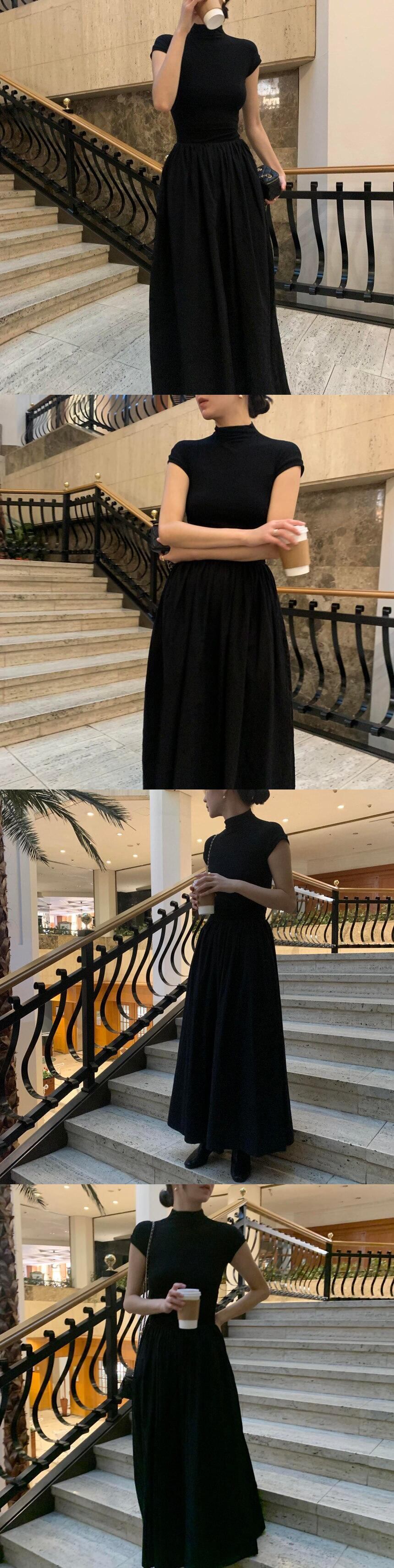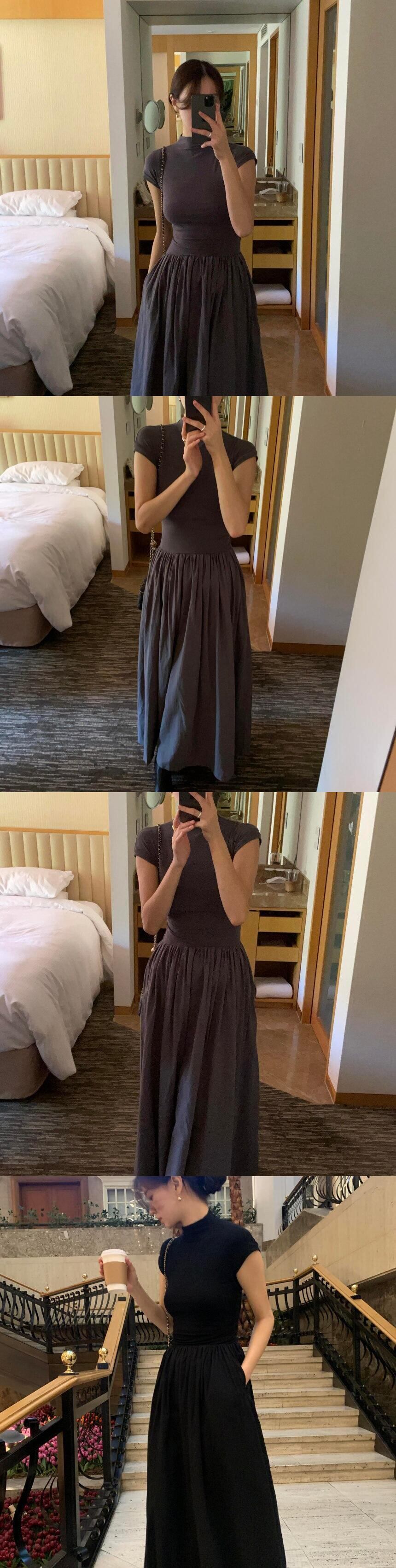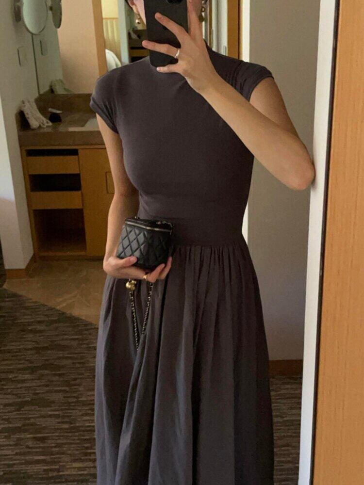 [EWQ] プリーツ スプライス O ネック ドレス半袖できる弾性ドレス夏潮乗り ショート ハーフスリーブ エラスティック 伸縮 サマー 夏物 Oネック