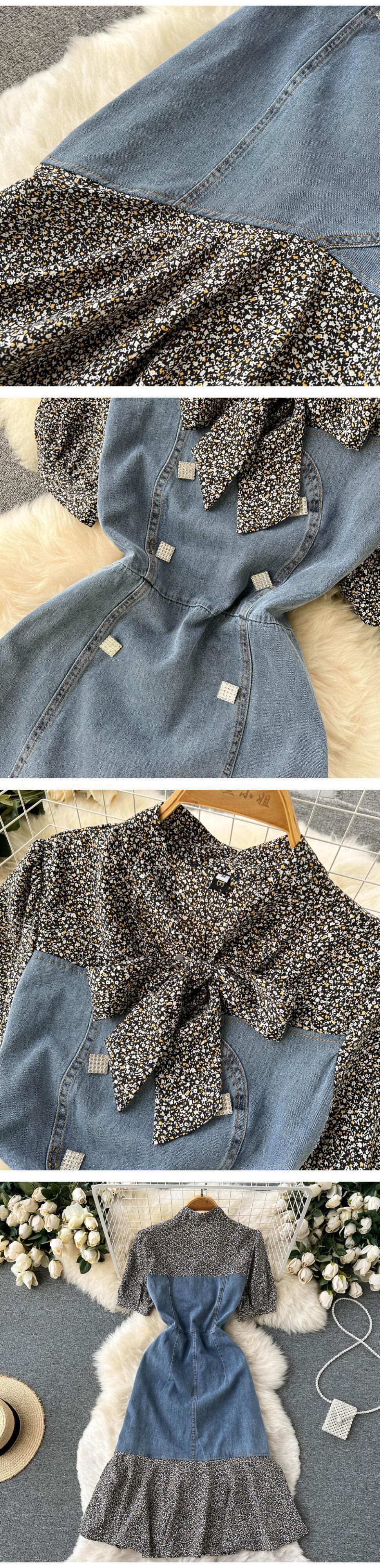 [EWQ] 夏 V ネックスリム ミディ ドレス花柄シフォン パッチワーク ジャン ドレス サマー 夏物 Vネック