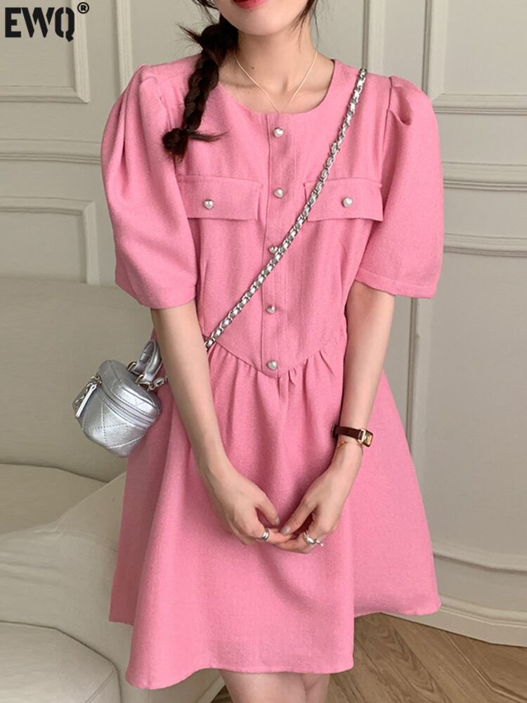 [EWQ] レディースラブボタンパフスリーブミニワンピース Oネック ピンク スイートプリーツ ショートドレス 夏潮 Vestido Y8186 大人ガーリー スウィート キュート カジュアル サマー 夏物