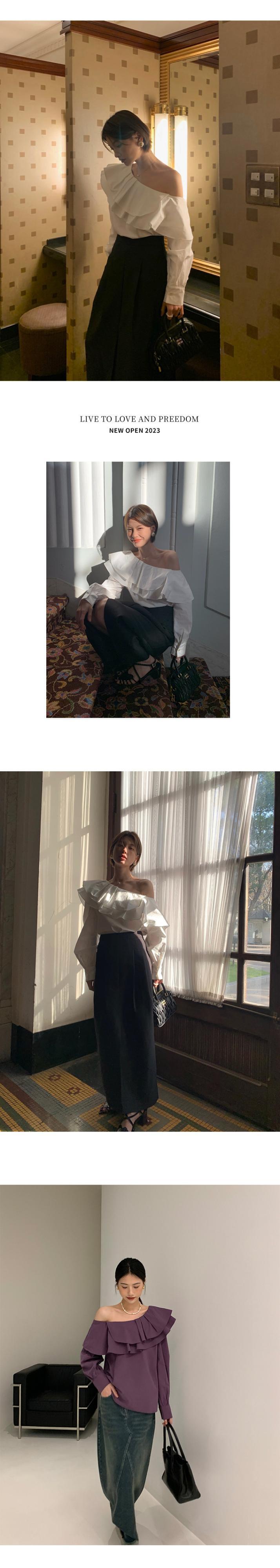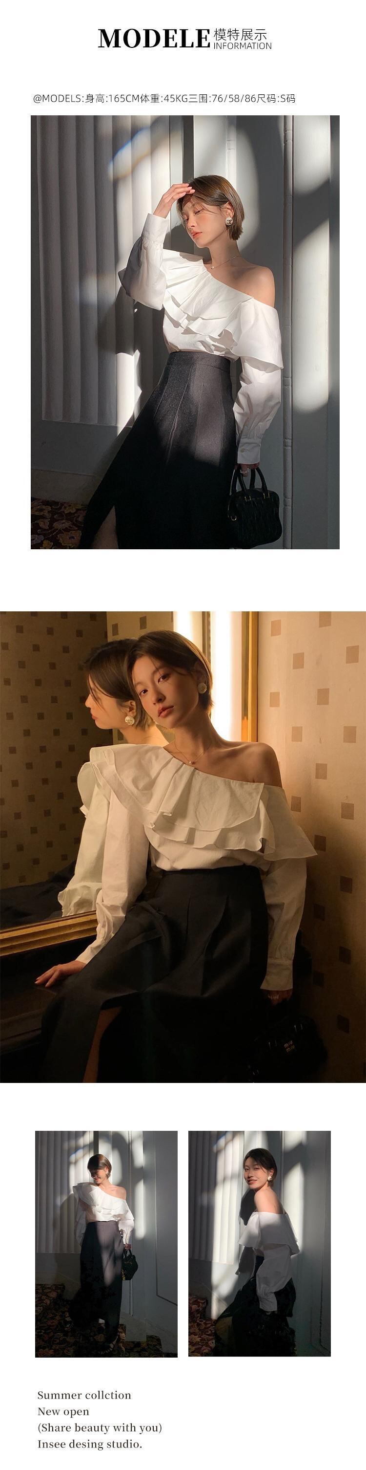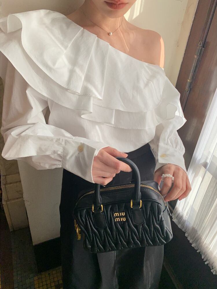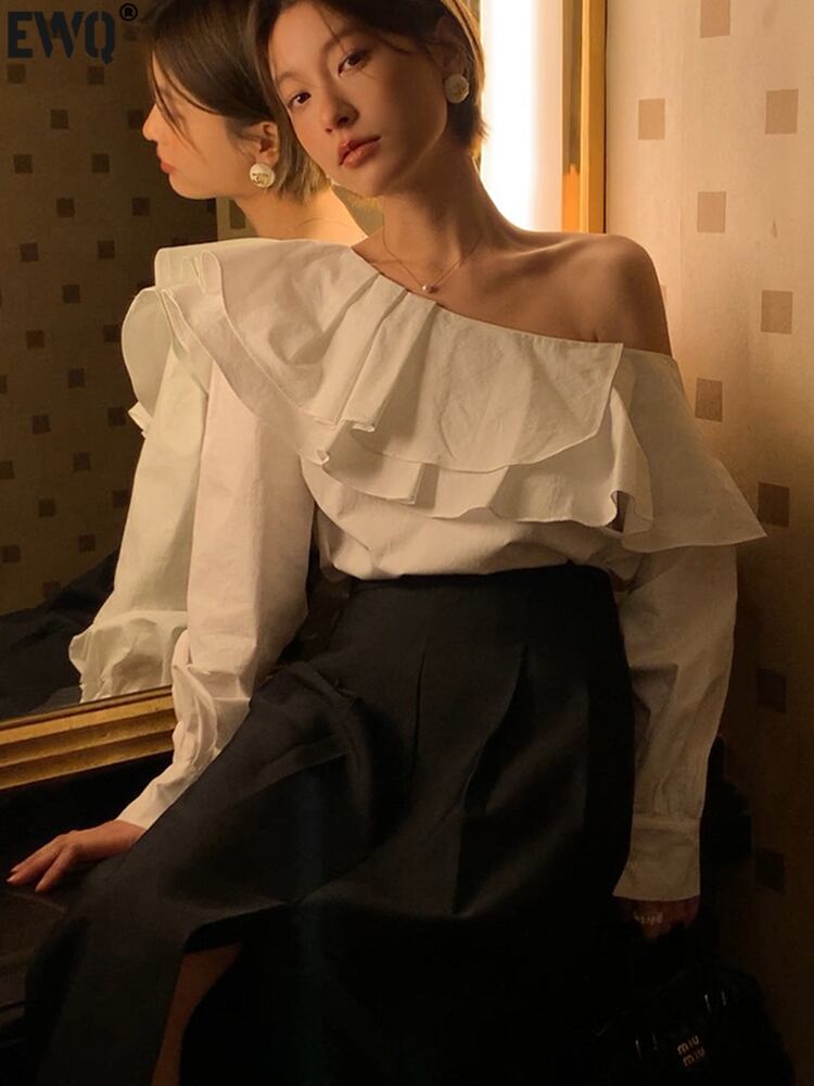 [EWQ] イレギュラー フリル 無地 シャツ レディース 長袖 スキューカラー ブラウス トップス 春夏トップス 6Y7355 ロング スプリング 春物 サマー 夏物 ソリッドカラー