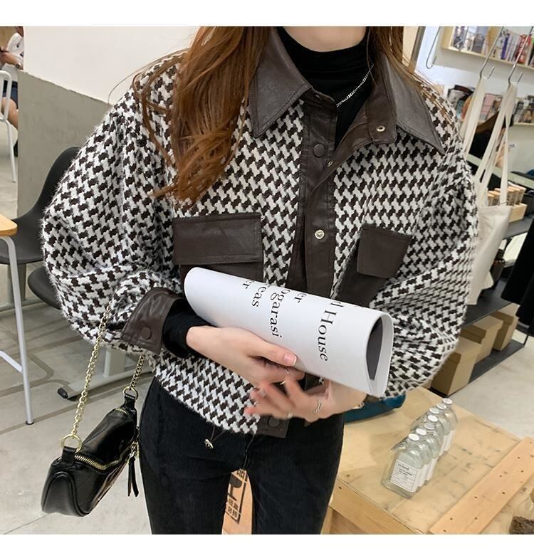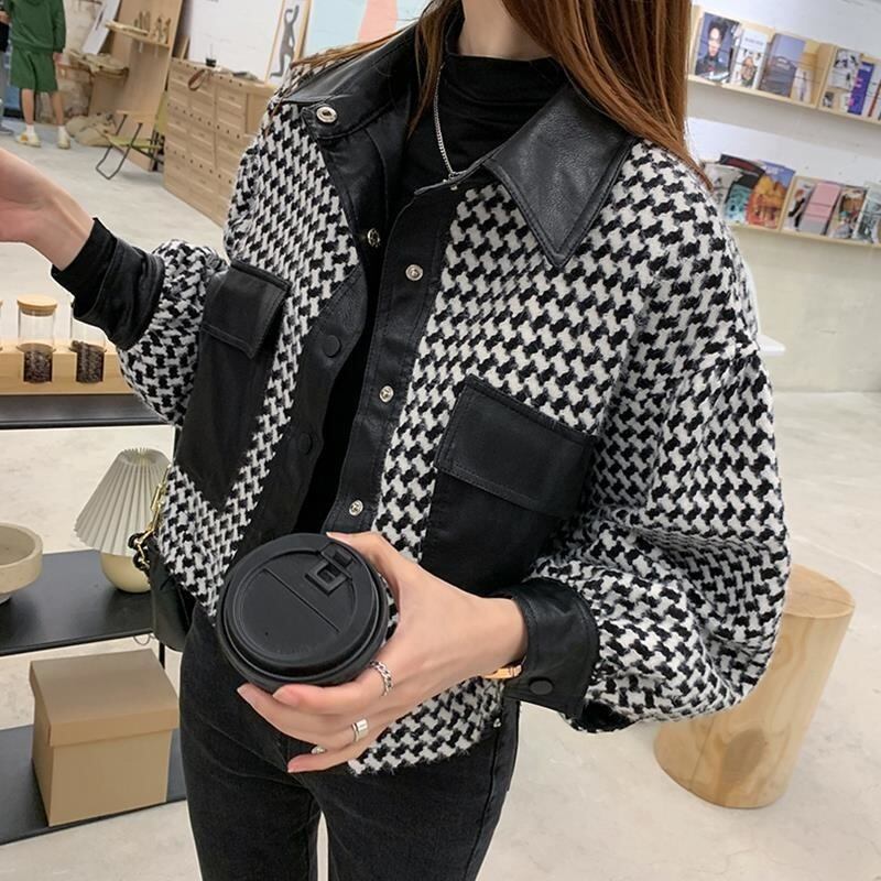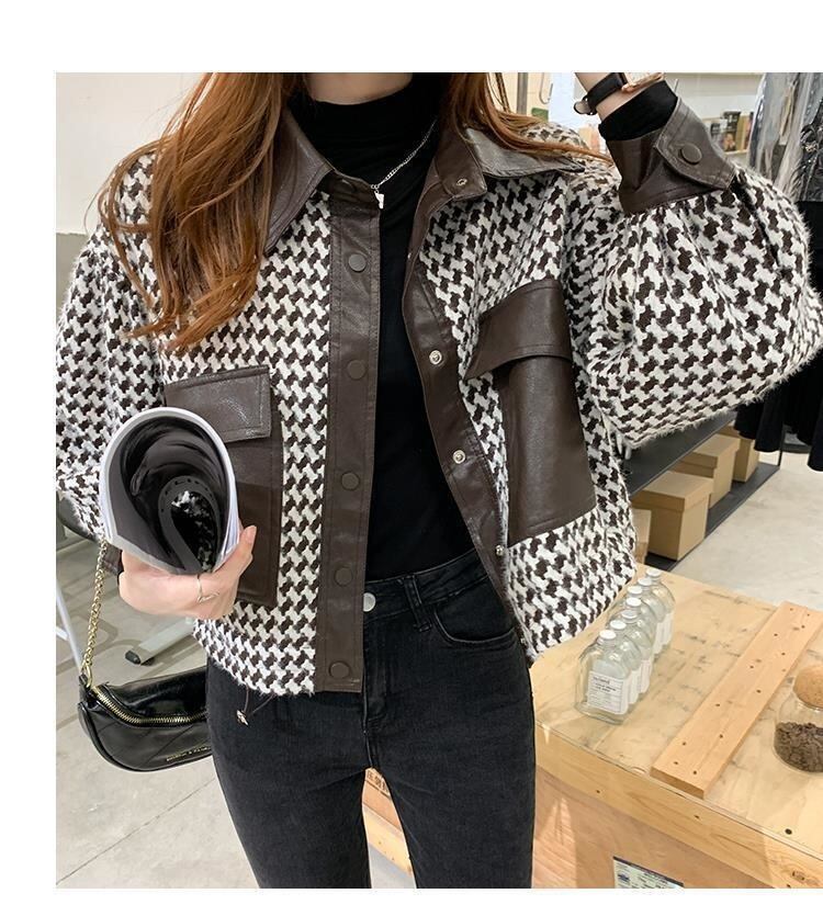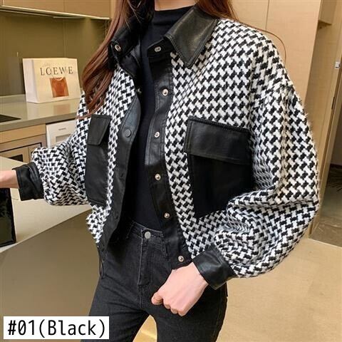 【EWQ】ジャケット レディース ショート 秋冬 ゆったり チェック柄 スプライシング スモール 万能 レザージャケット 16R51 オータム 秋物 ウィンター 冬物