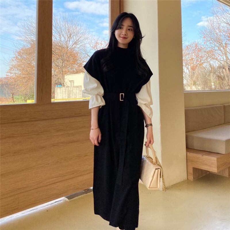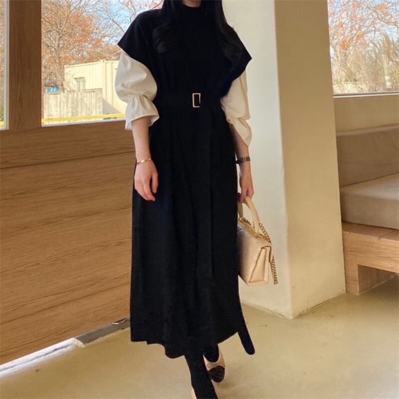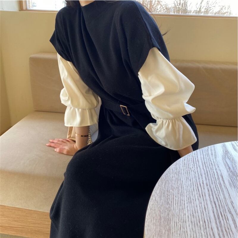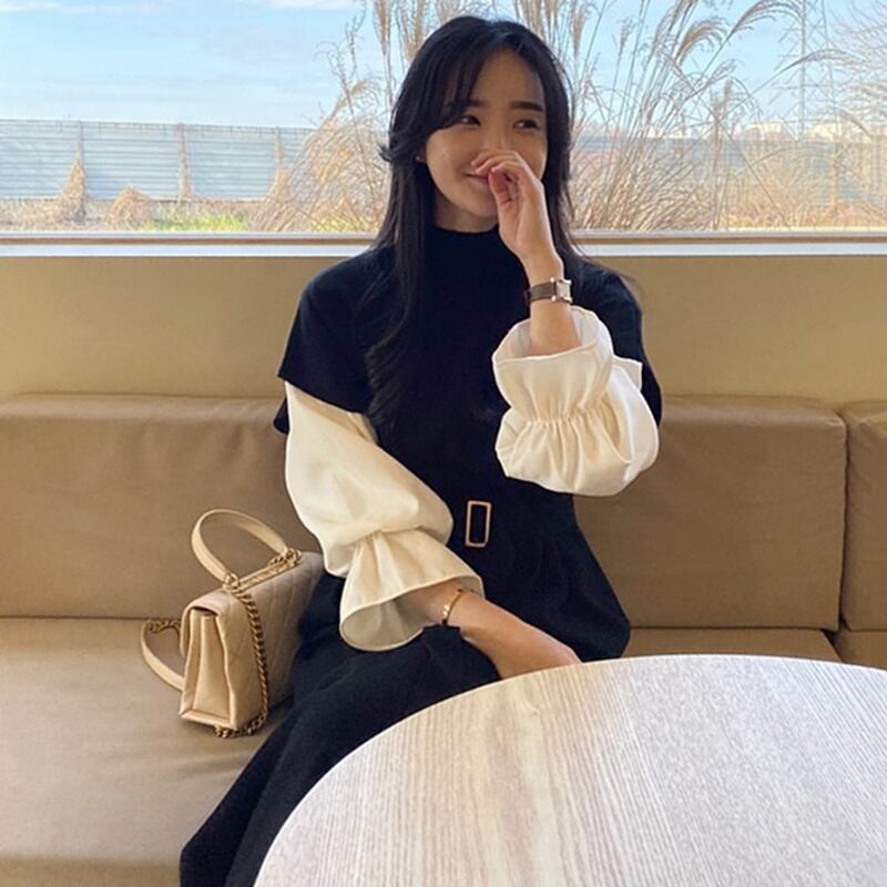 [EWQ] シック秋無地フレアスリーブシャツトップ + リングバックルウエストニットベストドレス 16E2697 レッド オータム 秋物 指輪 ソリッドカラー