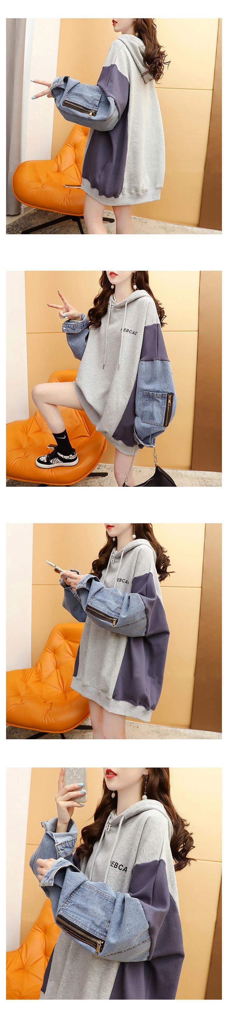 [EWQ] スウェットシャツパーカーパッチワークプルオーバーストリートガールズレタープリントフード付きデニムスプライシングトップス春 スプリング 春物