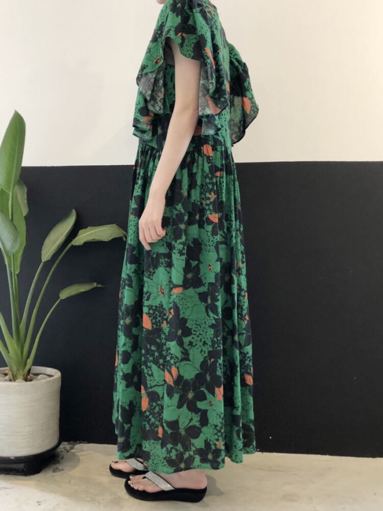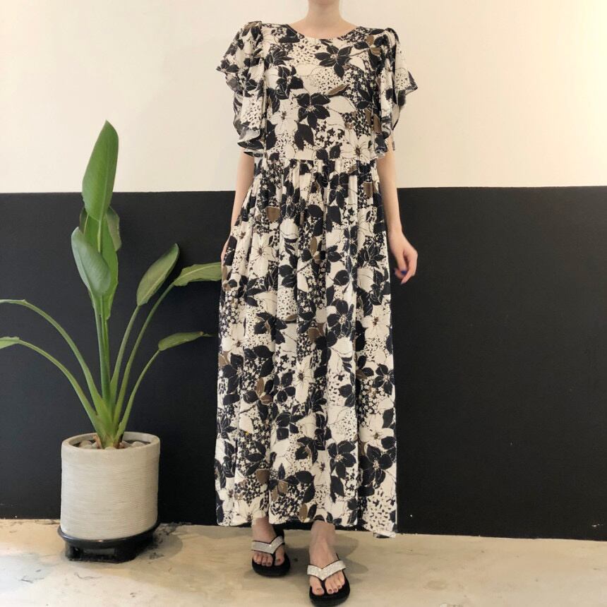 [EWQ] O ネック フラワー プリント ドレス バタフライ スリーブ コントラスト カラー プリーツ ルーズ ドレス サマー Vestido 7975 夏物 Oネック フラワーデザイン