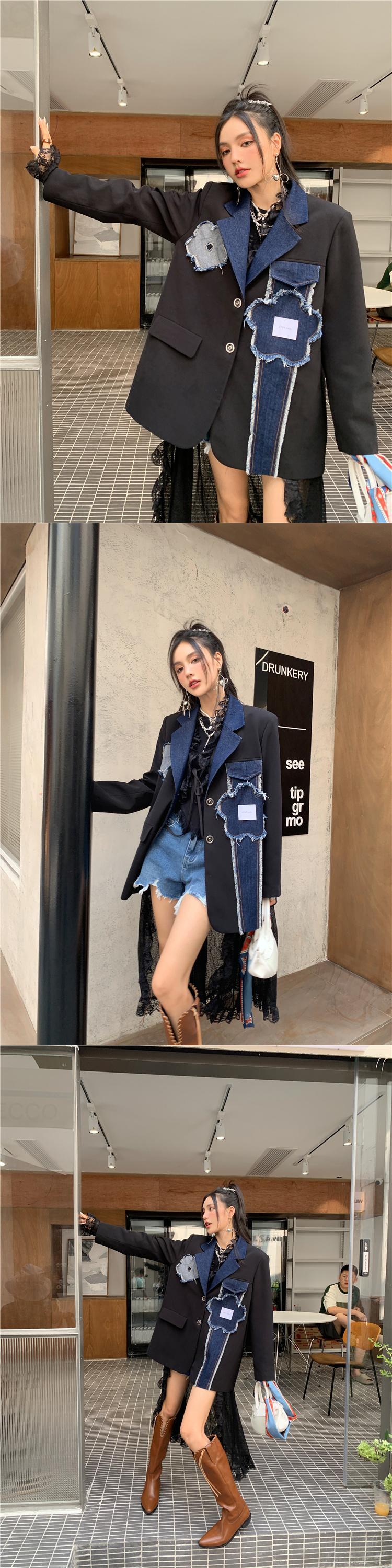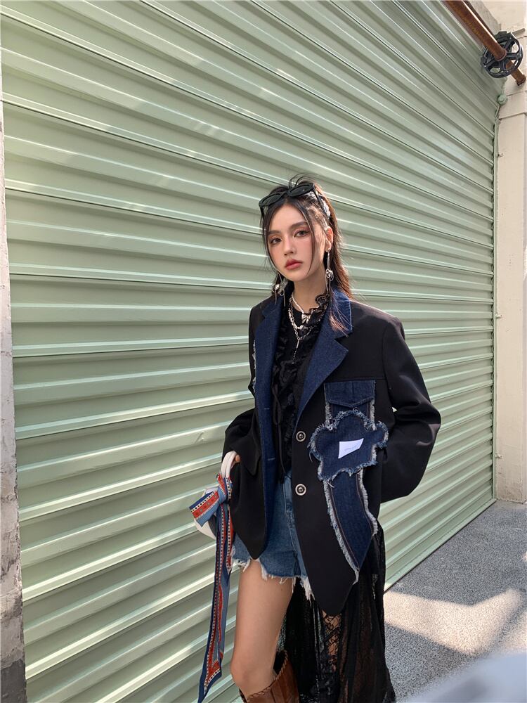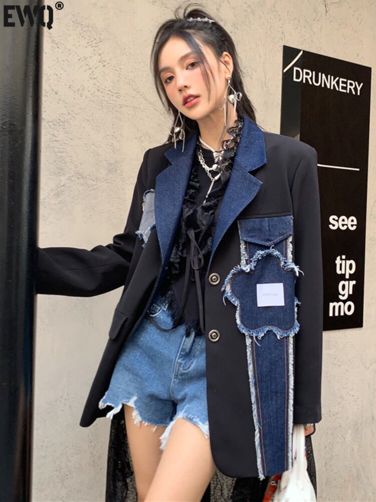 [EWQ] ストリート パッチワーク デニム ブレザー コート コントラスト カラー長袖ポケット スーツ ジャケット春秋トップ 7595 ロング スプリング 春物 オータム 秋物