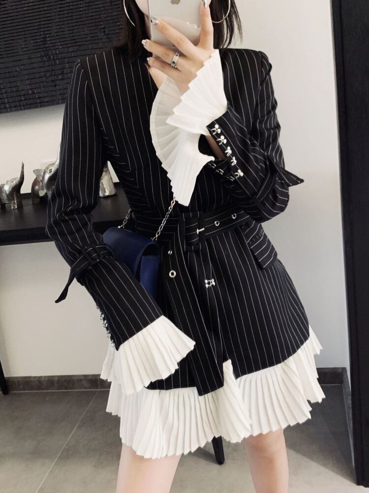 [EWQ] 春女 ブラック プリーツ スプリング 春物 ストライプ