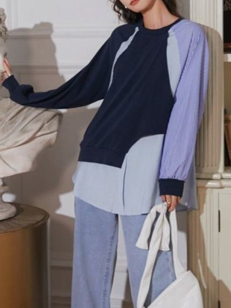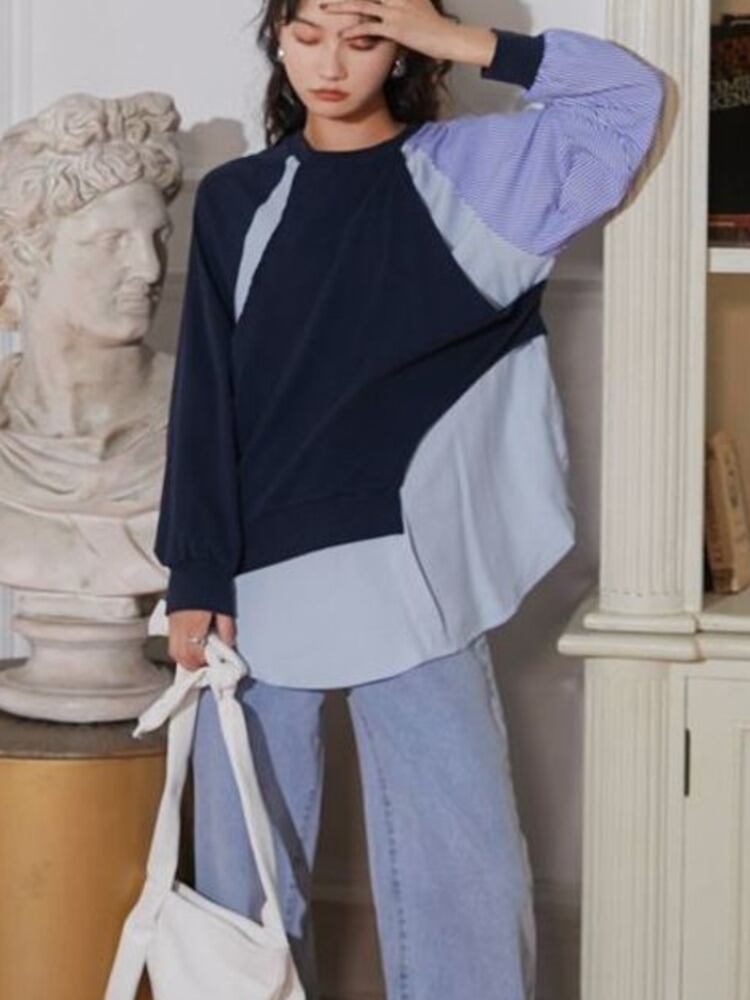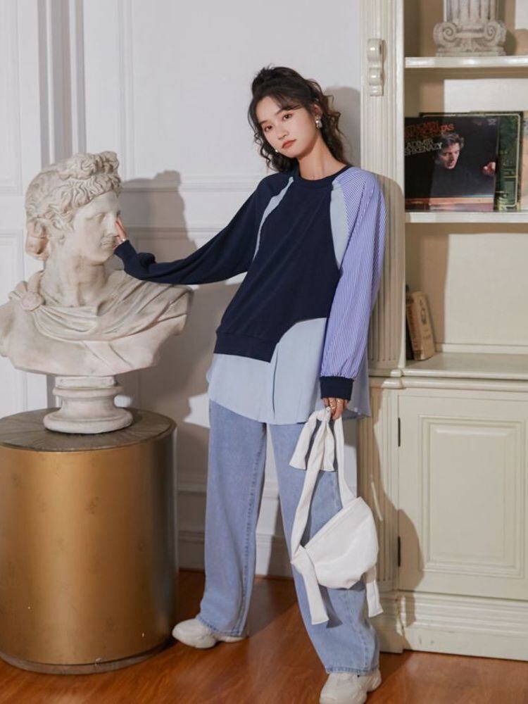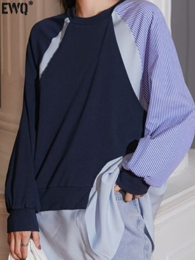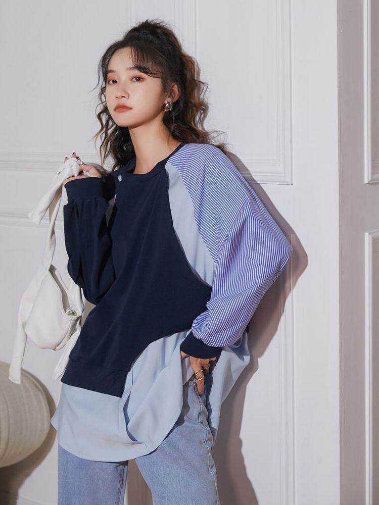 [EWQ] フェイクツーピーストレーナー長袖コントラストスプライシングプルオーバー春秋美しい服 Y6657 ロング スプリング 春物 オータム 秋物