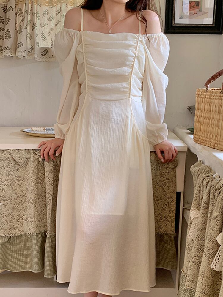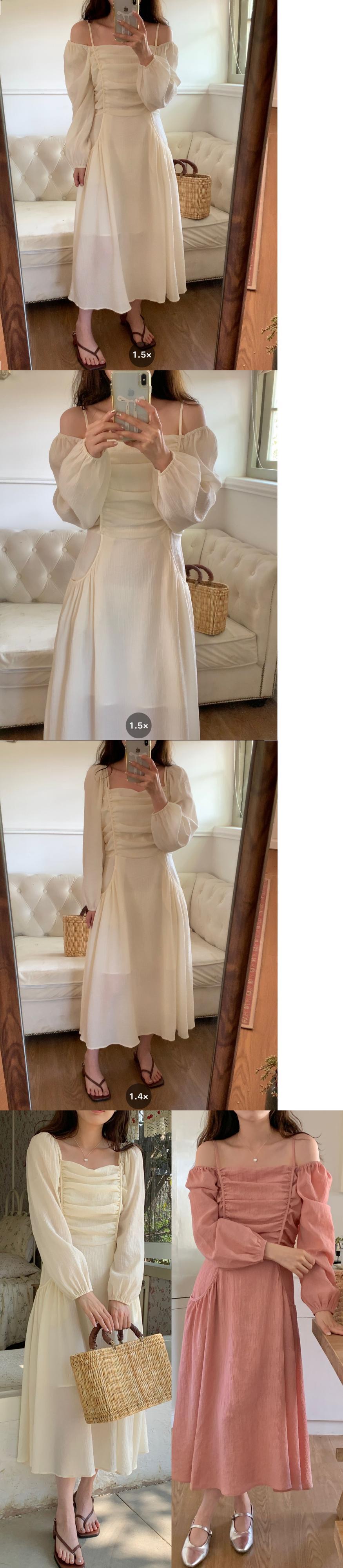 [EWQ] レディース オフショルダードレス 2着 プリーツウエスト パフスリーブ スリングドレス サマージッパー Vestido 261 夏物