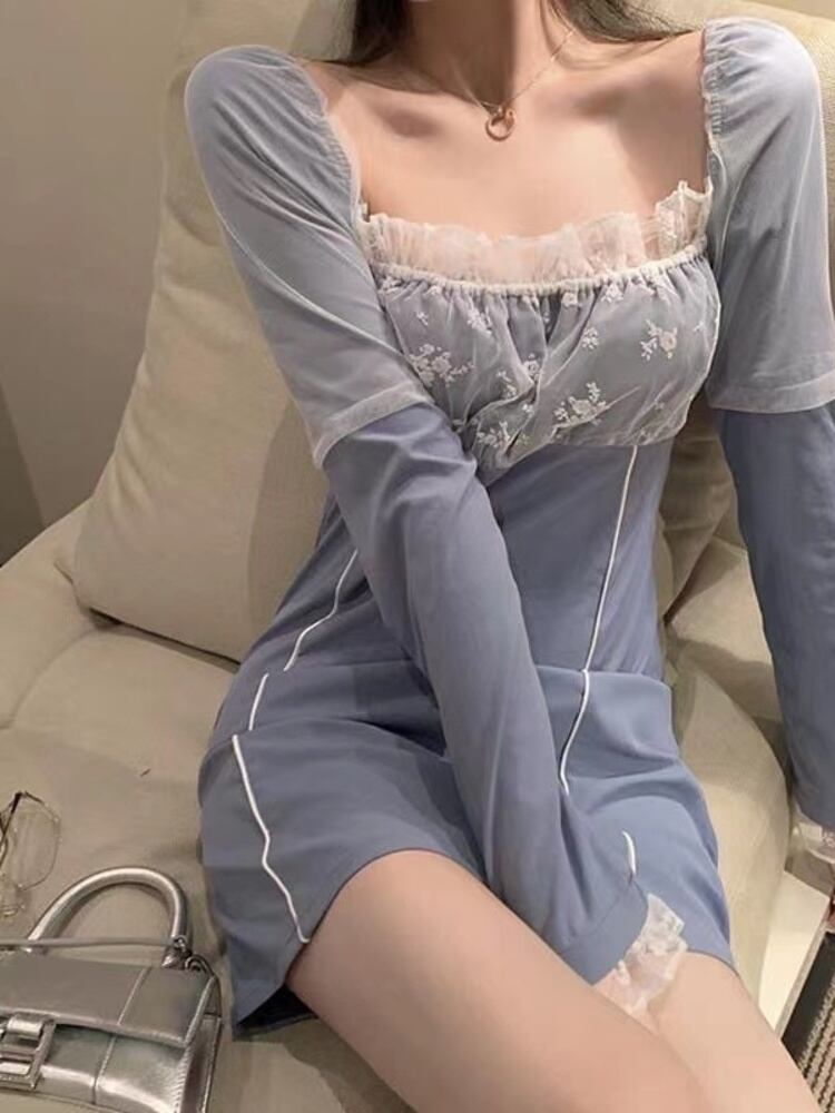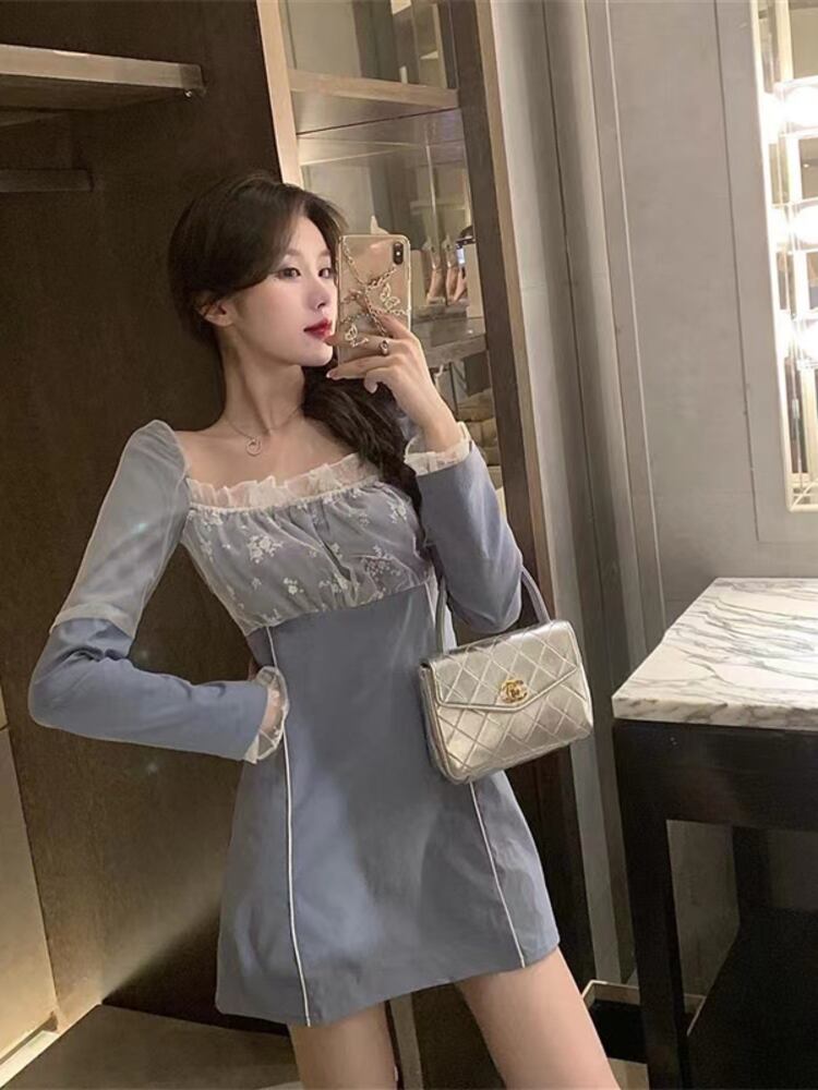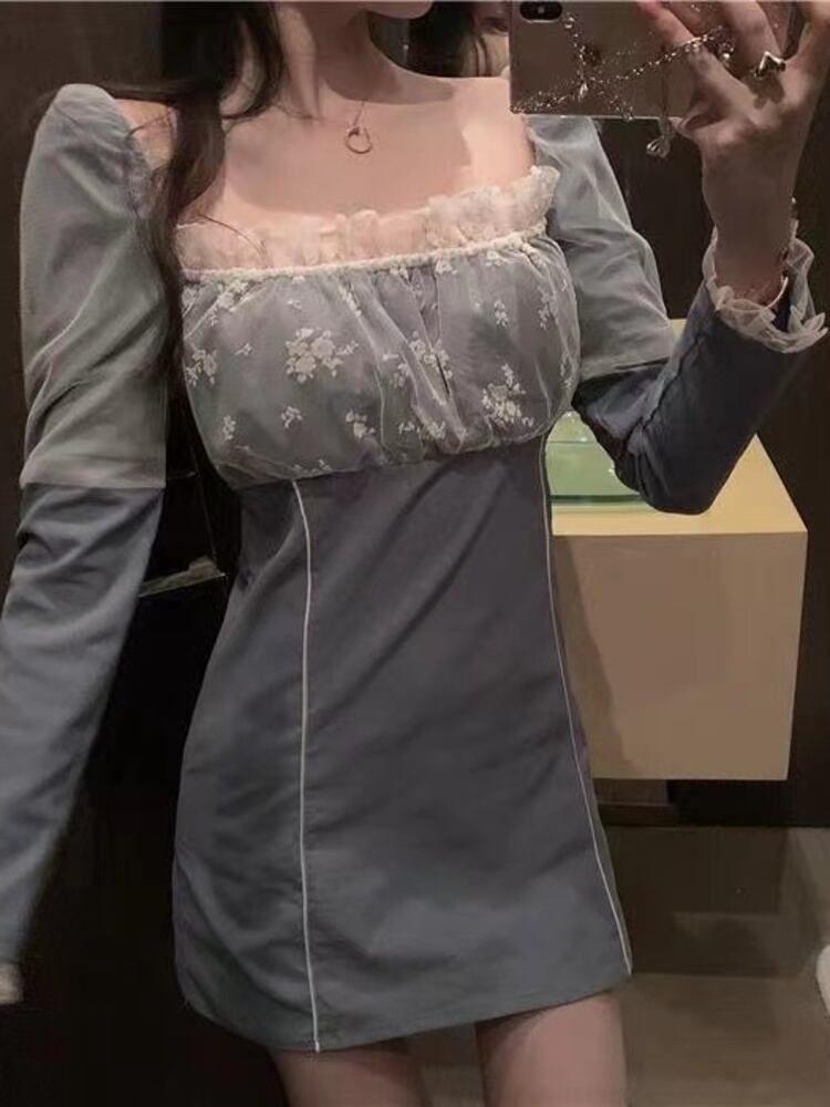 [EWQ] レース パッチワーク スクエア ネック ドレス長袖コントラスト ミニ ドレス春夏 Vestido 7148 ロング スプリング 春物 サマー 夏物 スクウェア