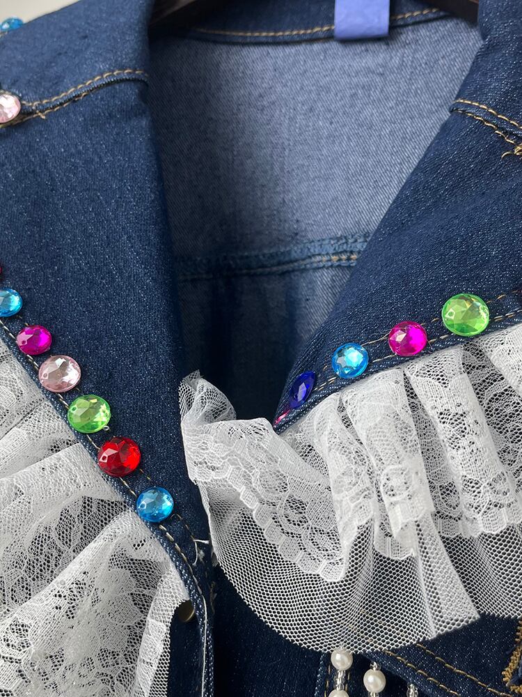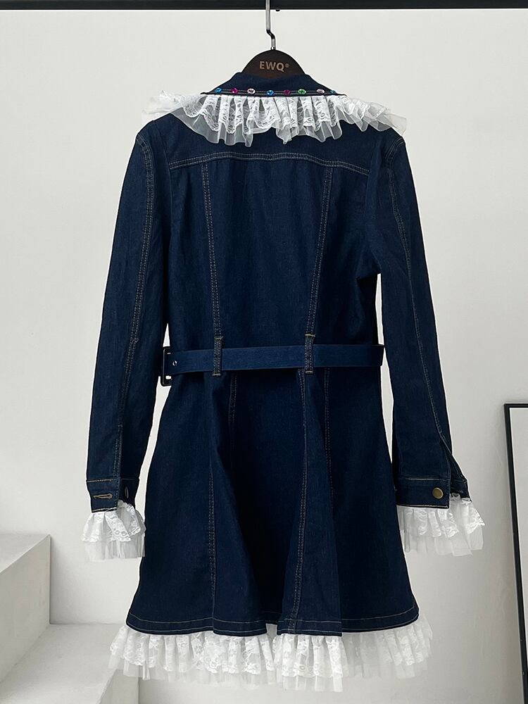 [EWQ] レースパッチワーククリスタルスプライシングデニムドレスレースアップラプルシングルブレストドレス春秋 Vestido スプリング 春物 オータム 秋物