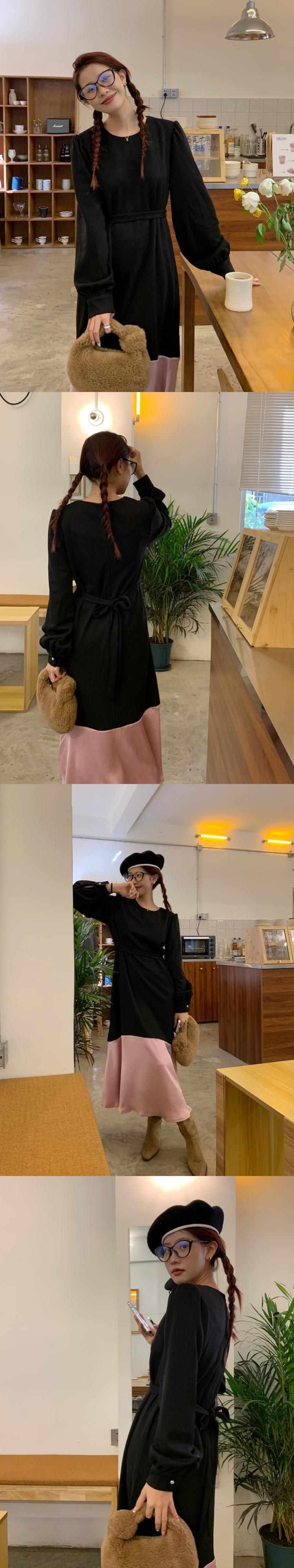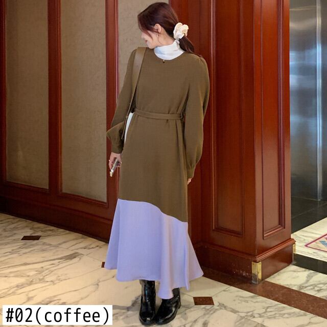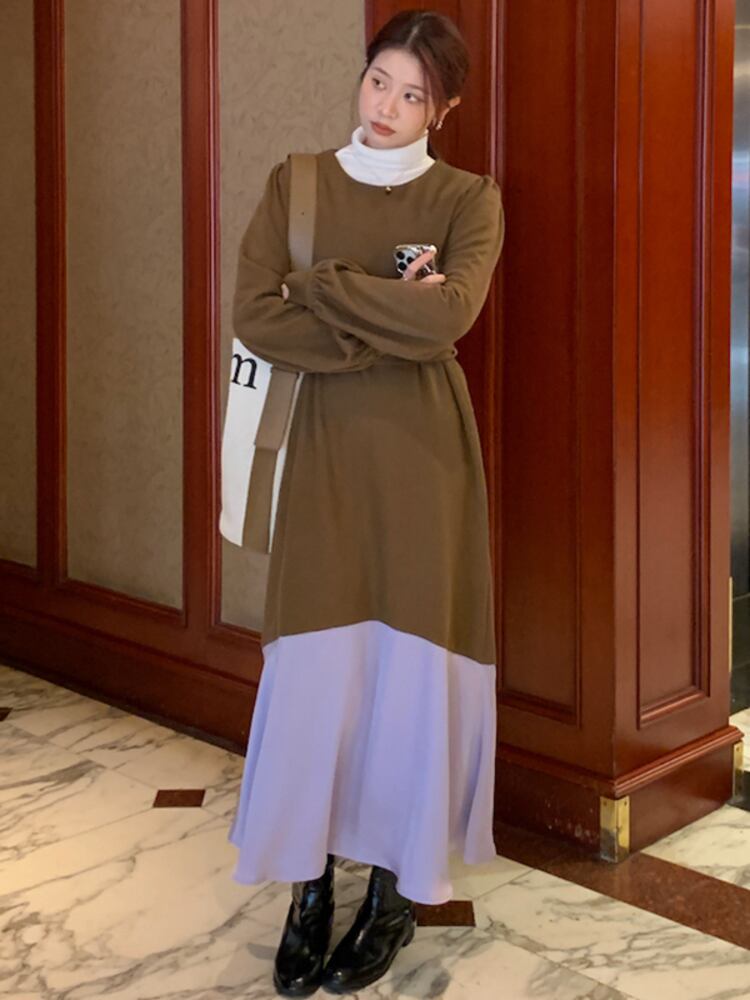 [EWQ] パッチワーク レース アップ ウエスト トランペット ドレスコントラスト カラー長袖ドレス春秋 Vestido ロング スプリング 春物 オータム 秋物 レースアップ