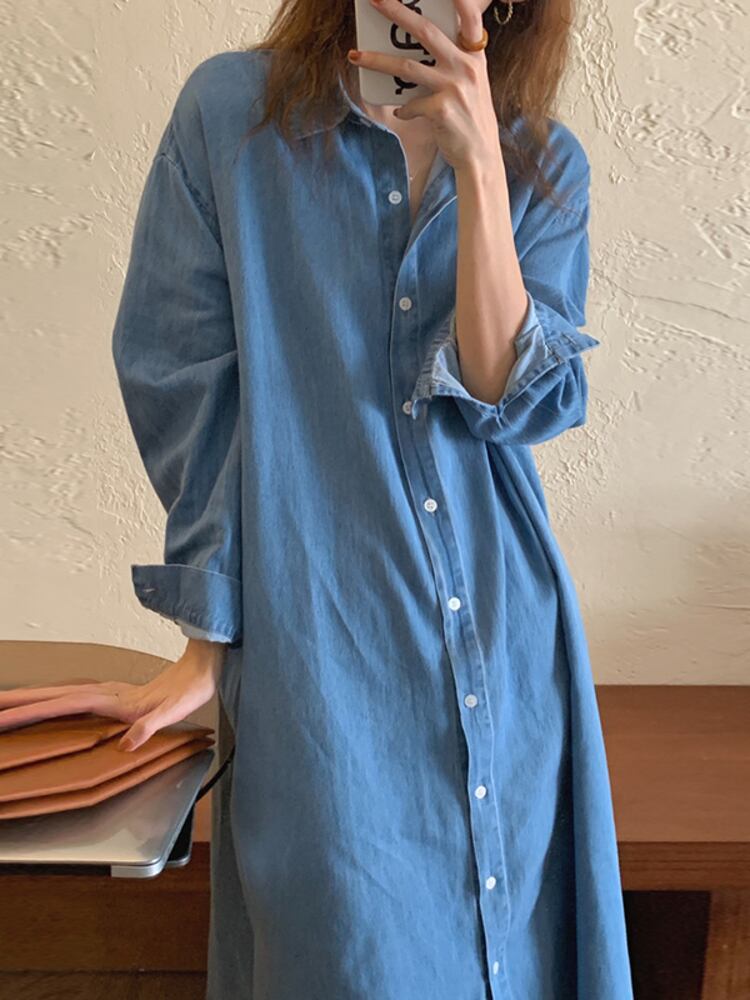[EWQ] シックマイノリティ ルーズ長袖ウォッシュ デニム ドレス春秋シングル ブレスト Vestido 16Y601 ロング スプリング 春物 オータム 秋物