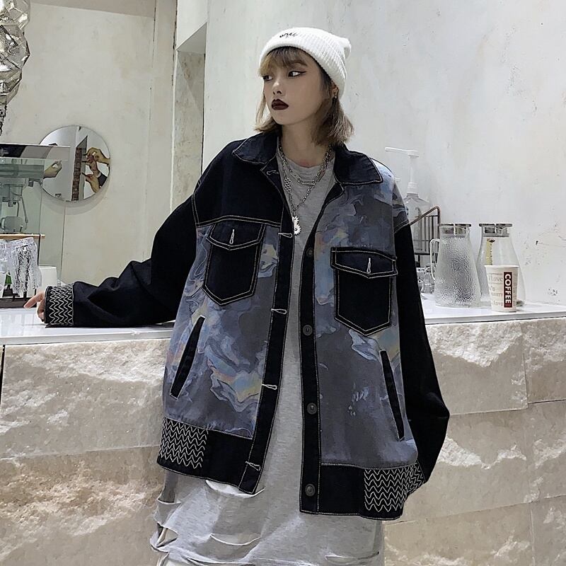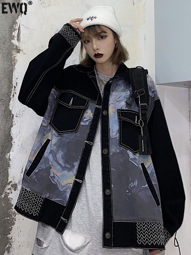 [EWQ] コントラストカラーデニムジャケットルーズストリートロングスリーブジャケットコート春秋潮トップ 16Y7836 長袖 スプリング 春物 オータム 秋物
