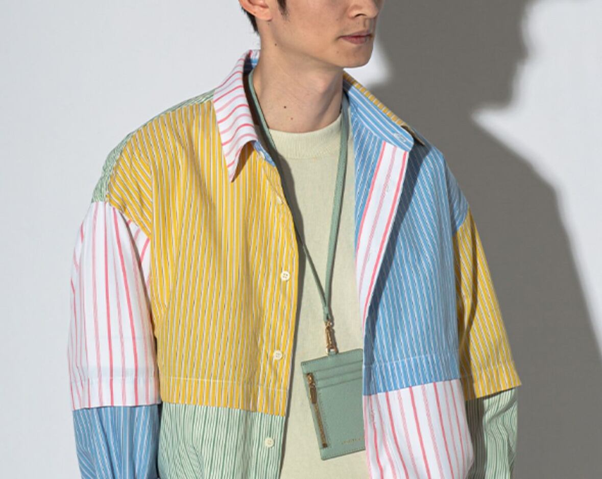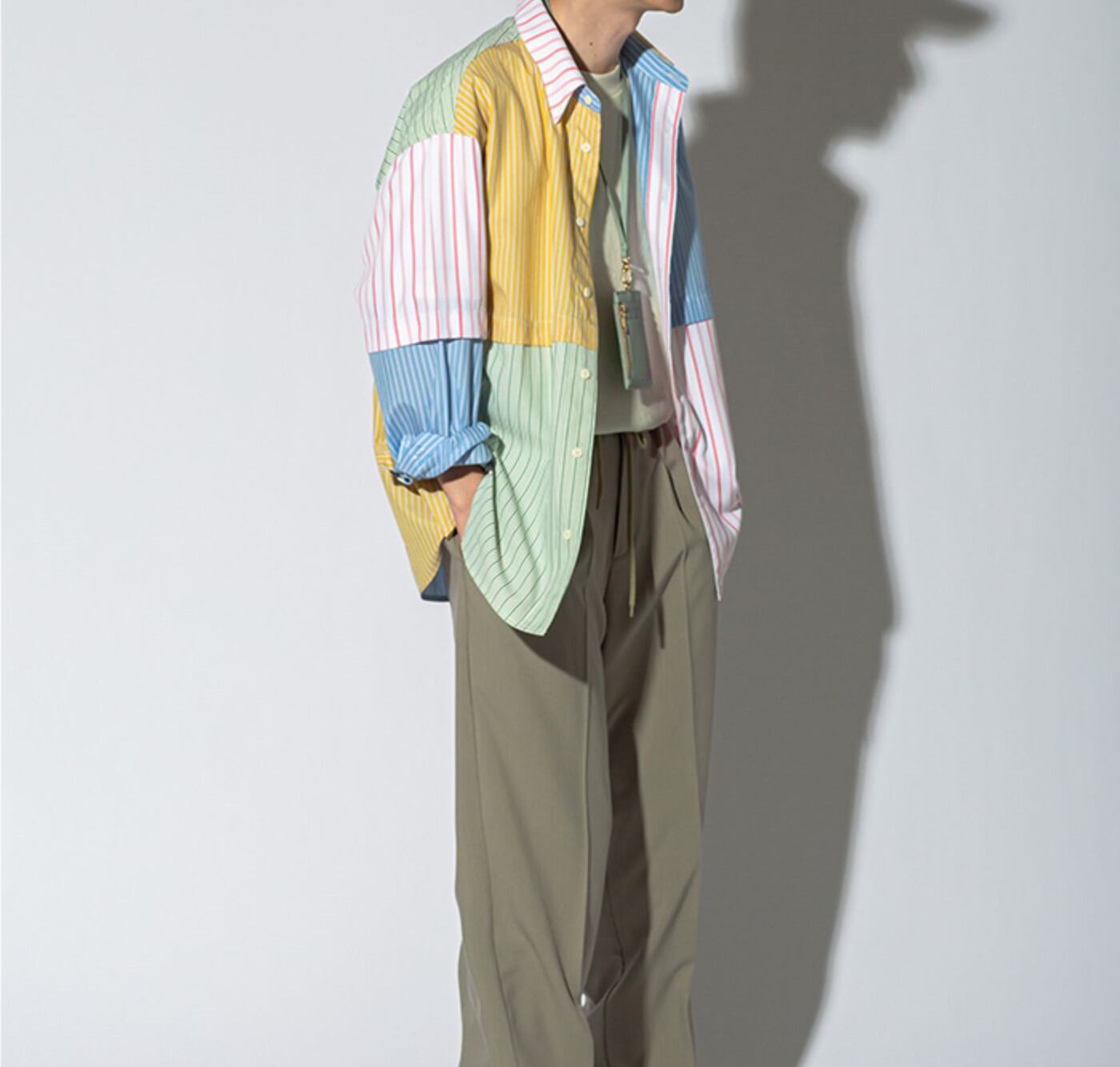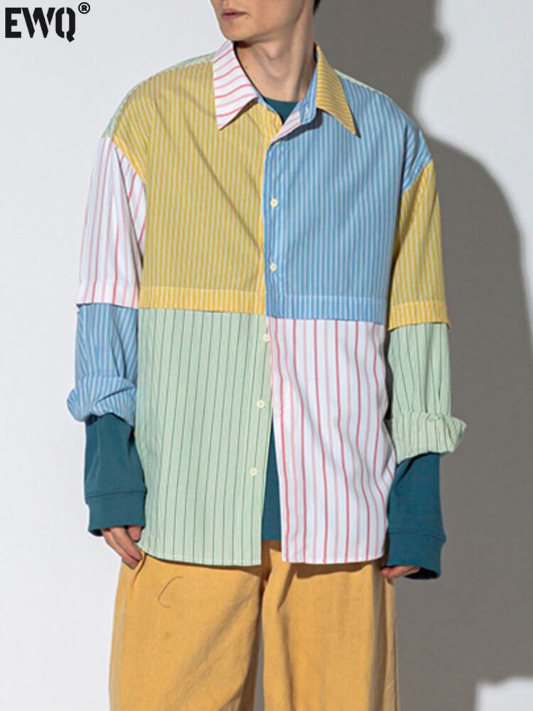 [EWQ] レディース 長袖 パッチワーク ストライプシャツ コントラストカラー ラプル シングルブレスト ブラウス トップス 春秋 24 ロング スプリング 春物 オータム 秋物
