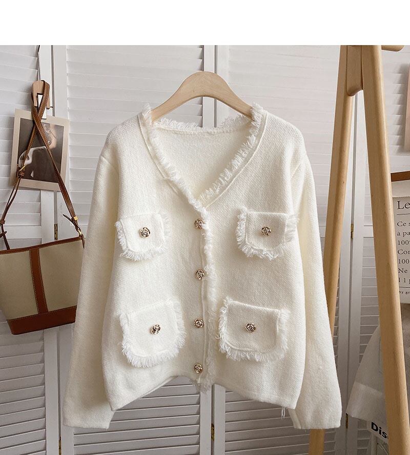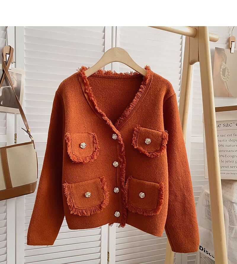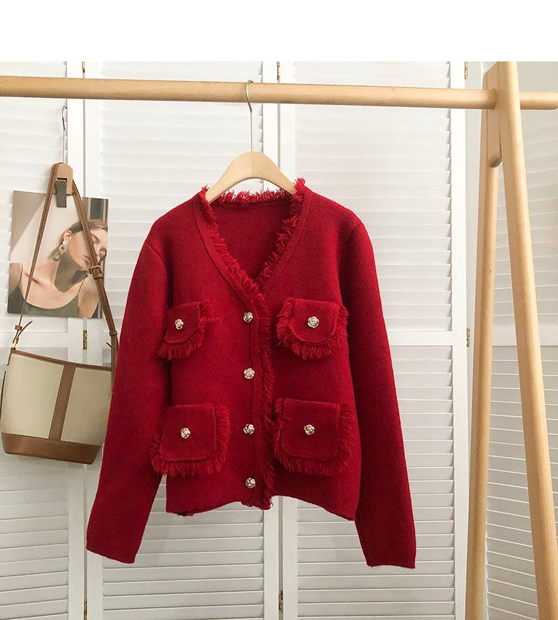 [EWQ] 秋春スプライシング ポケット ツイード コート ルーズ美しいジャケット赤トップス V ネック ニット レッド スプリング 春物 オータム 秋物 Vネック