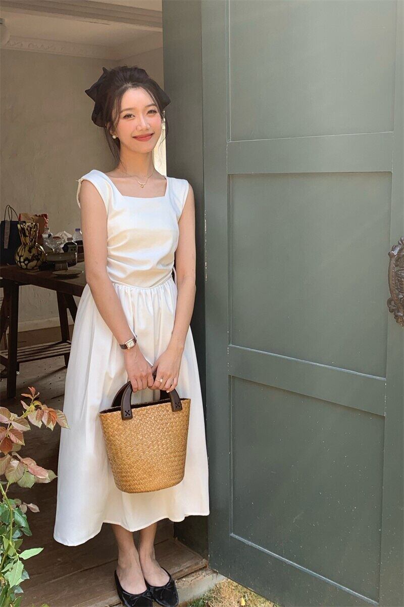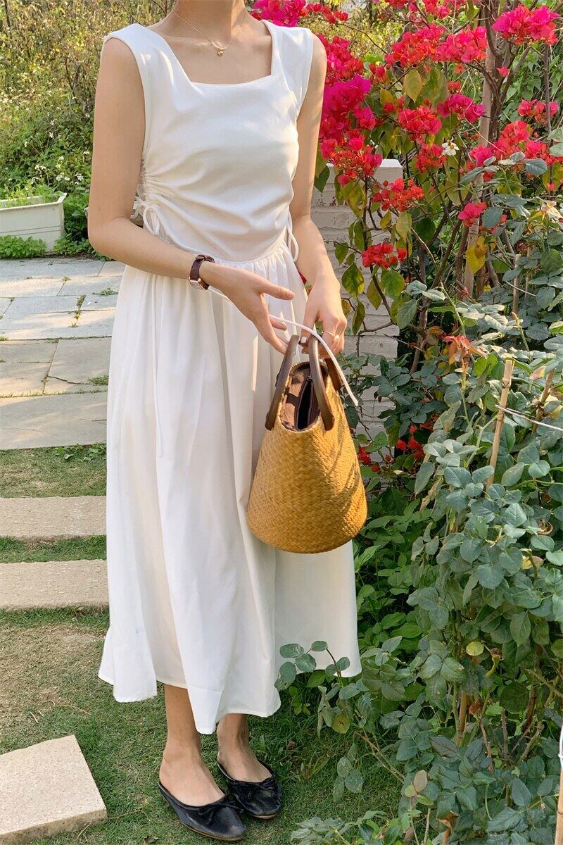 [EWQ] シンプルスクエア ネック プリーツ ベスト ドレス無地ドローストリング ウエスト ドレス夏ノースリーブ Rode 12 サマー 夏物 ソリッドカラー スクウェア