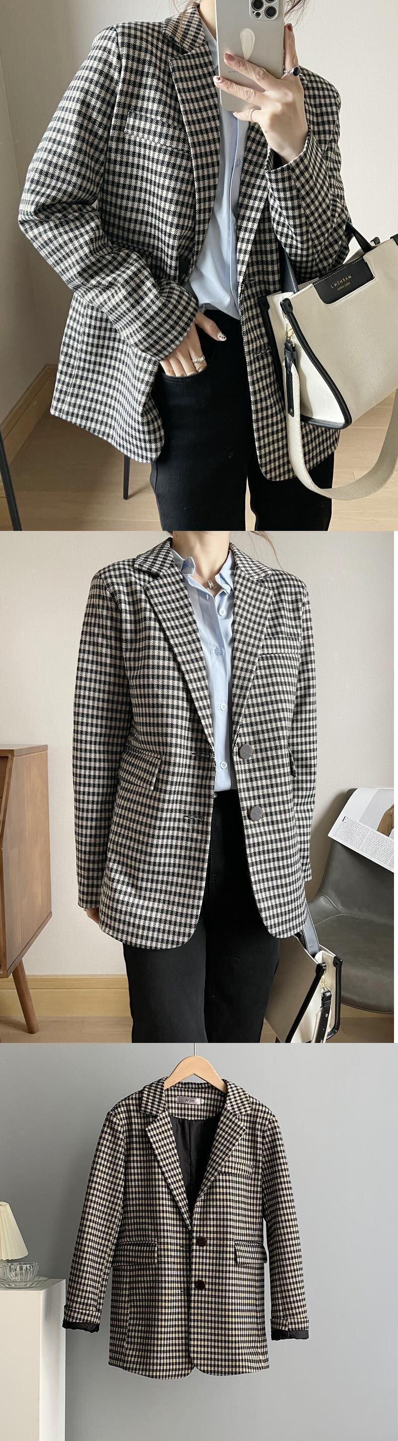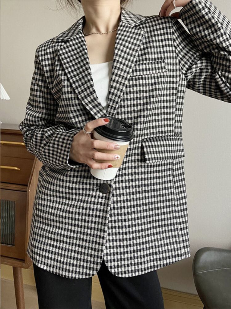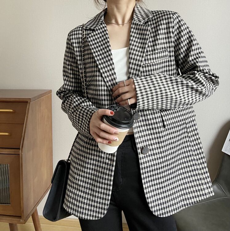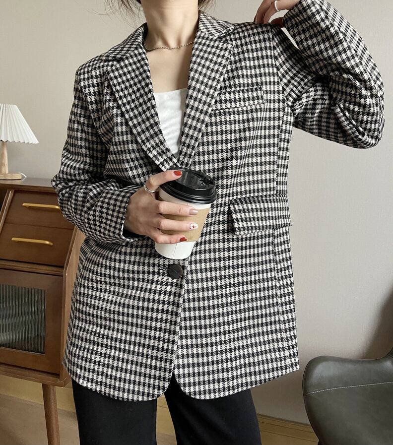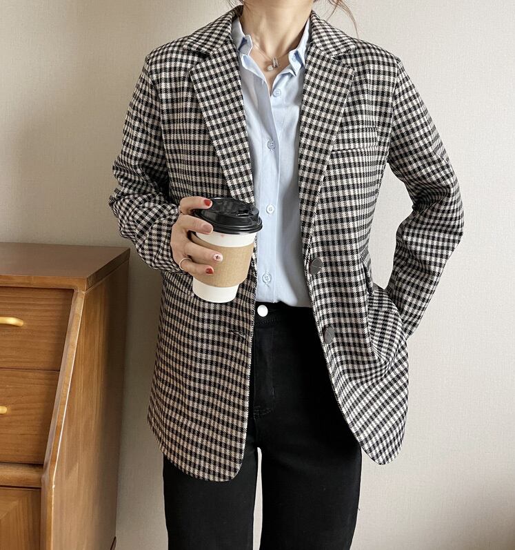 [EWQ] チェック柄ブレザーコートポケットコントラストカラーシックジャケットスーツ春秋長袖スーツ 301 ロング スプリング 春物 オータム 秋物