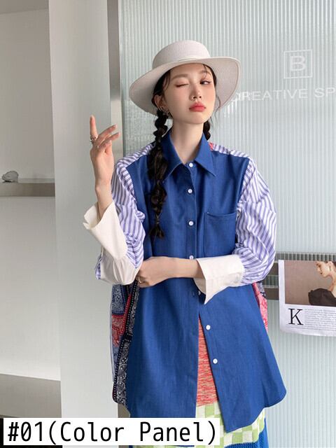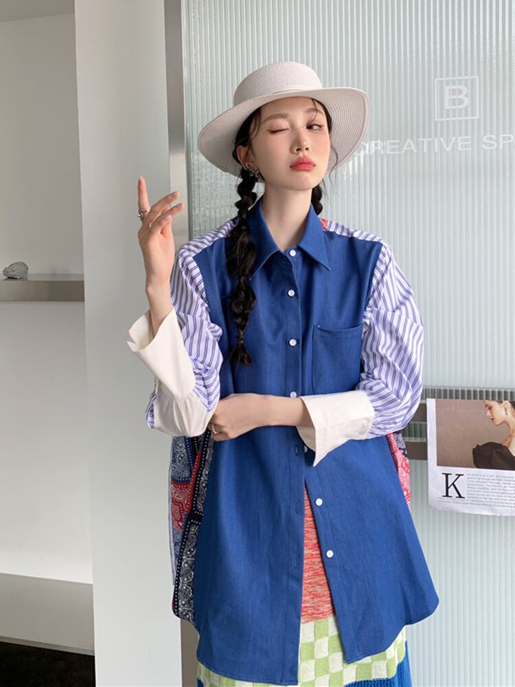 【EWQ】ターンダウンカラー ビッグサイズ パッチワークシャツ 長袖 コントラスト オーバーサイズ ストライプ ブラウス 春 ロング スプリング 春物