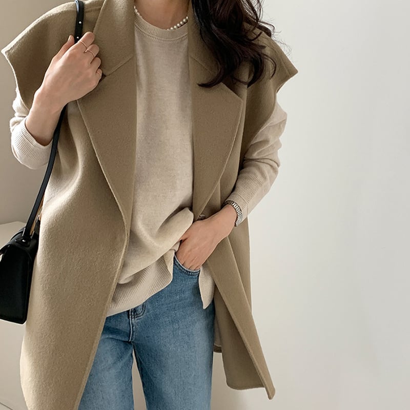 【EWQ】シックアウター秋春コートノッチドバンデージウエストベスト薄手両面ウールジャケット スプリング 春物 オータム 秋物