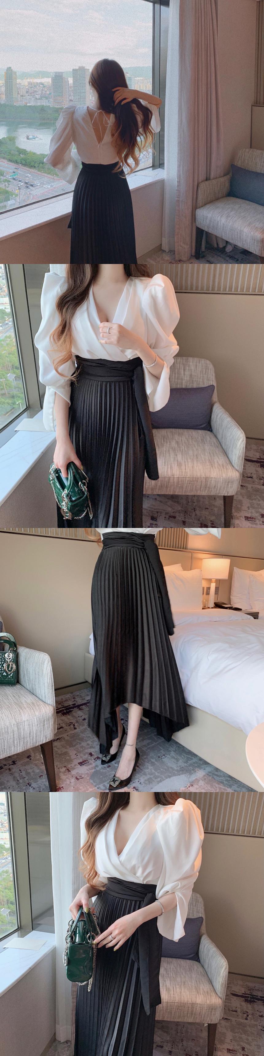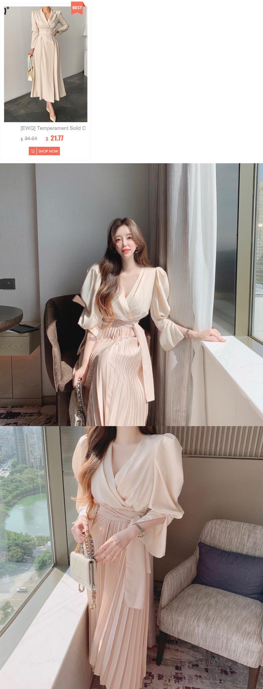 [EWQ] シッククロスオーバー V ネック不規則レースアップ収集ウエスト パフ スリーブ プリーツ ミッドカーフ ドレス秋 16R1381 オータム 秋物 Vネック