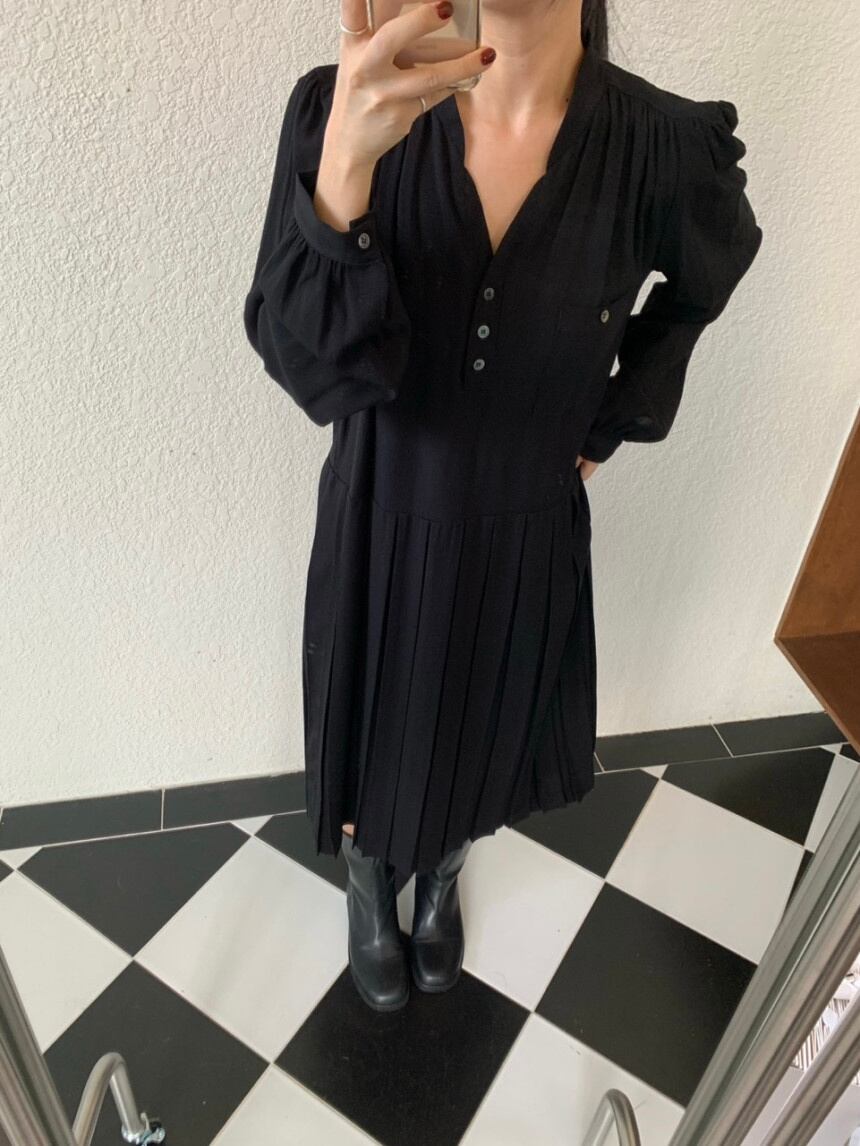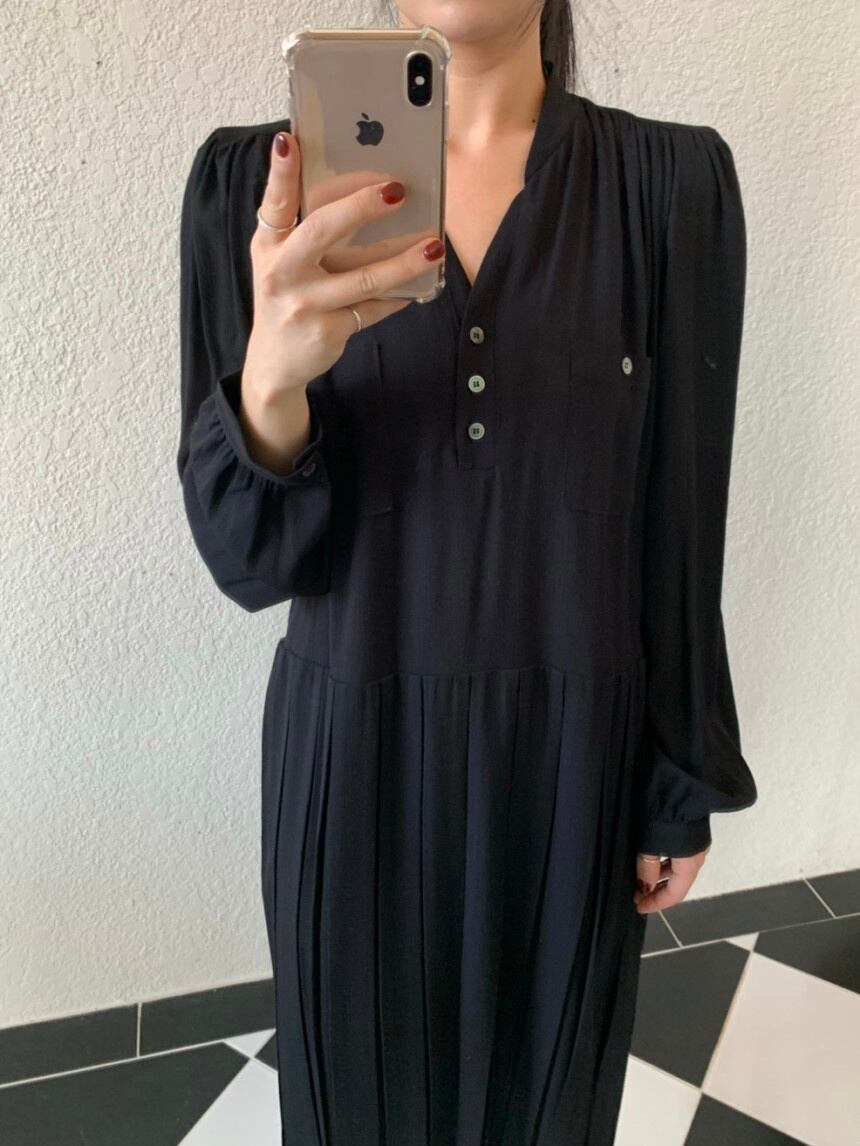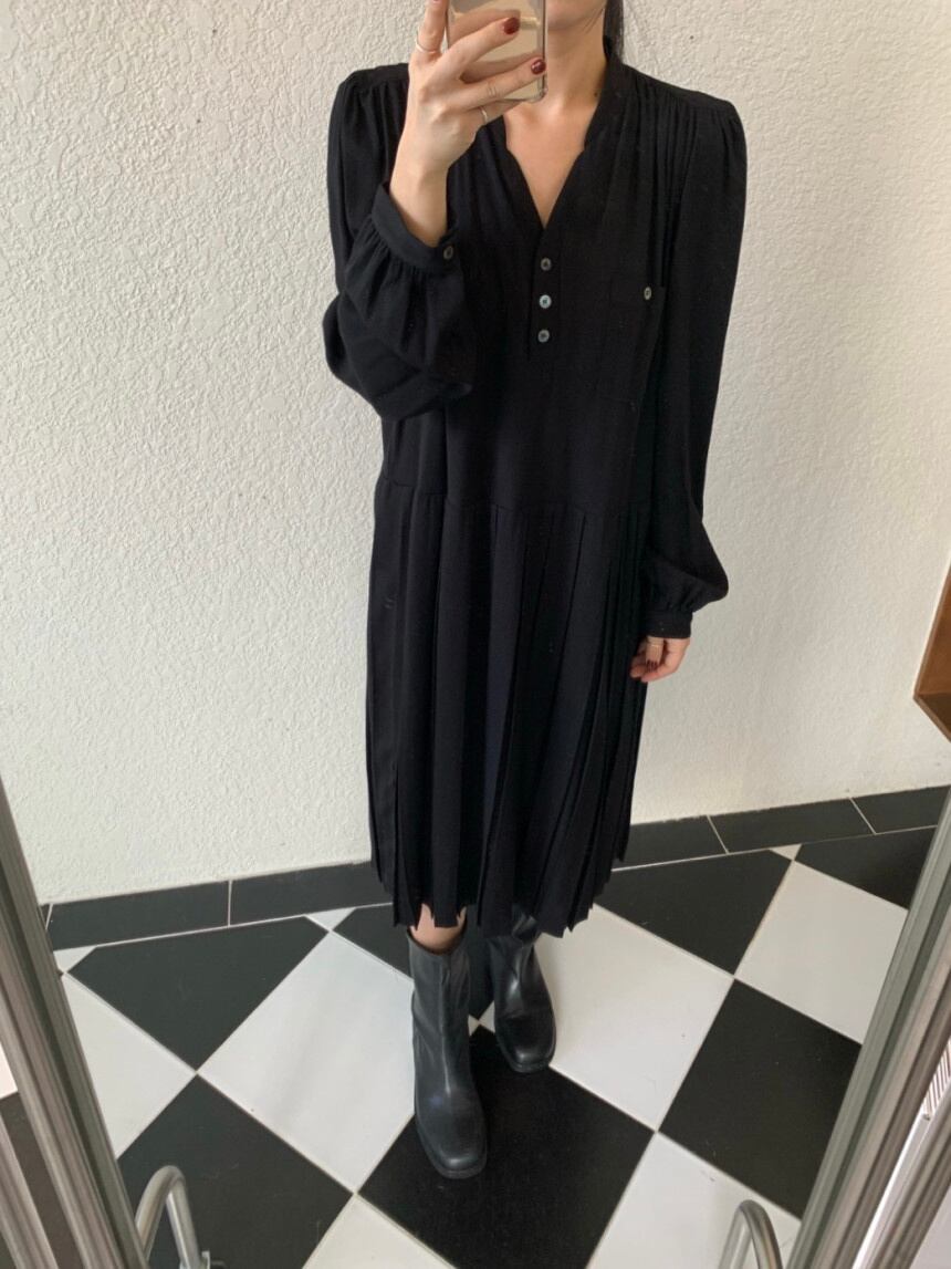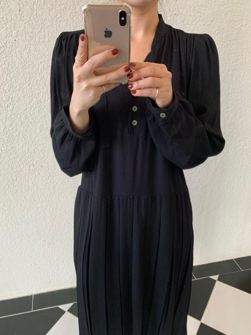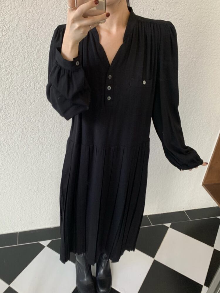[EWQ] シンプル V ネック ルーズ ドレスパッチワーク プリーツ パフ スリーブ ドレス春秋 Vestido スプリング 春物 オータム 秋物 Vネック