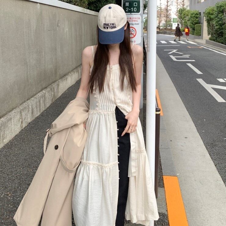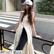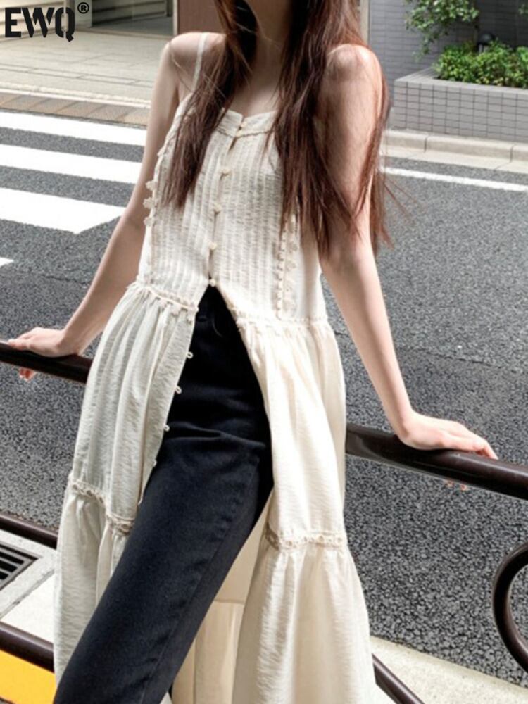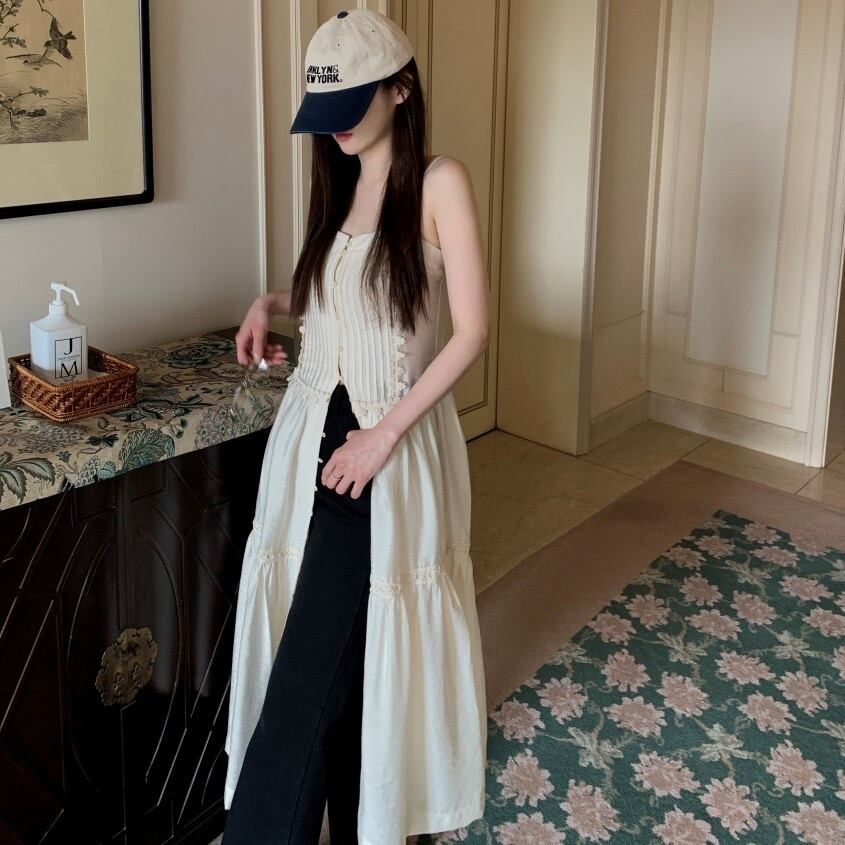[EWQ] スクエア レース スプライシング スプリット ベスト ドレス ノースリーブ フリル パッチワーク無地ドレス夏 Vestido サマー 夏物 ソリッドカラー スクウェア