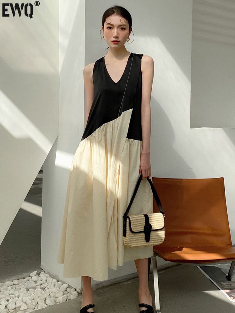 [EWQ] 不規則パッチワーク V ネック ドレス夏できるコントラスト カラー ノースリーブ ドレス Vestido 6Y8053 サマー 夏物 Vネック