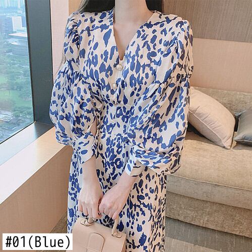 【EWQ】気質綺麗VネックランタンスリーブロングプリントドレスVestidos青ローブ春Vestido Y3870 ブルー スプリング 春物