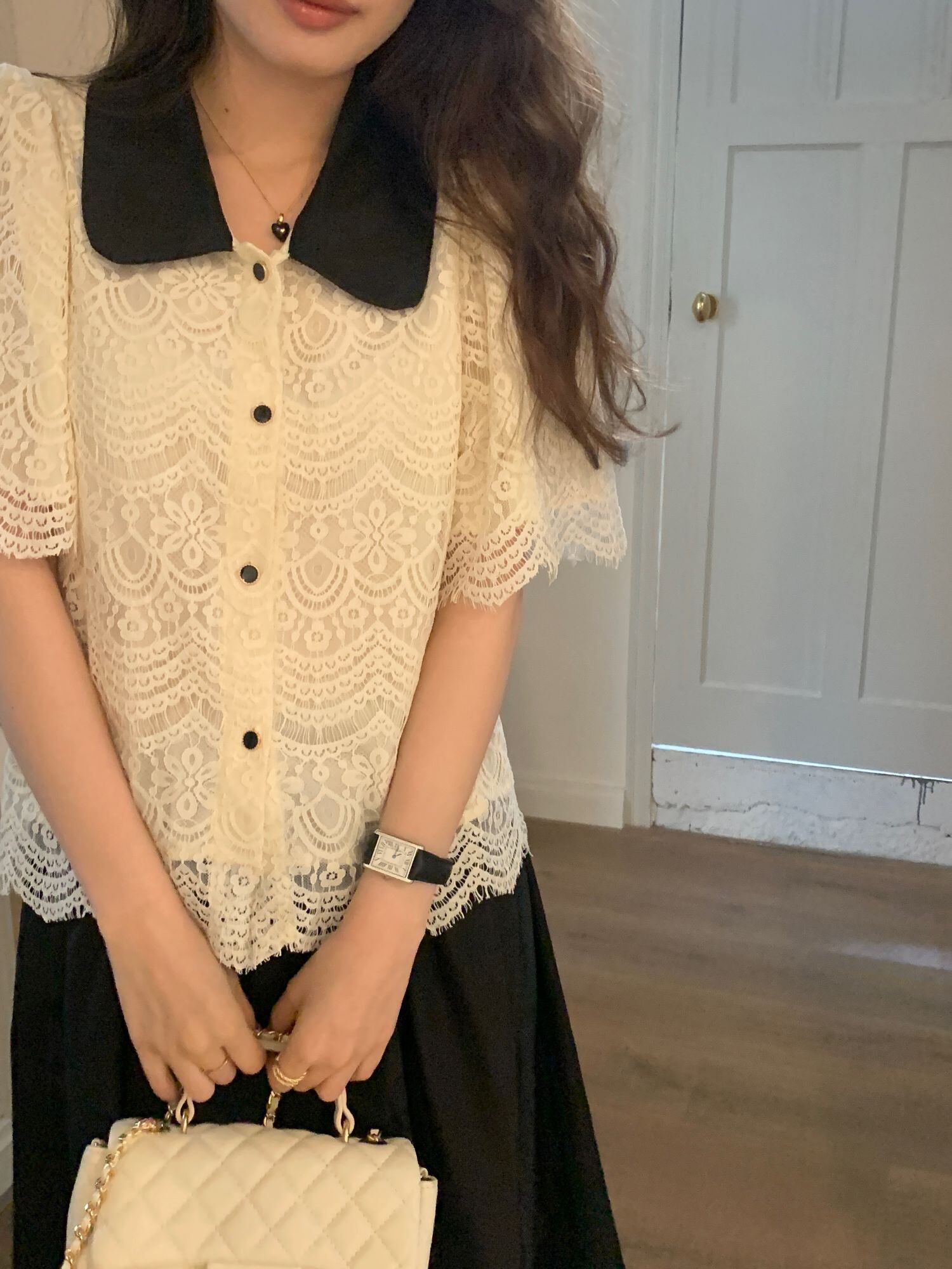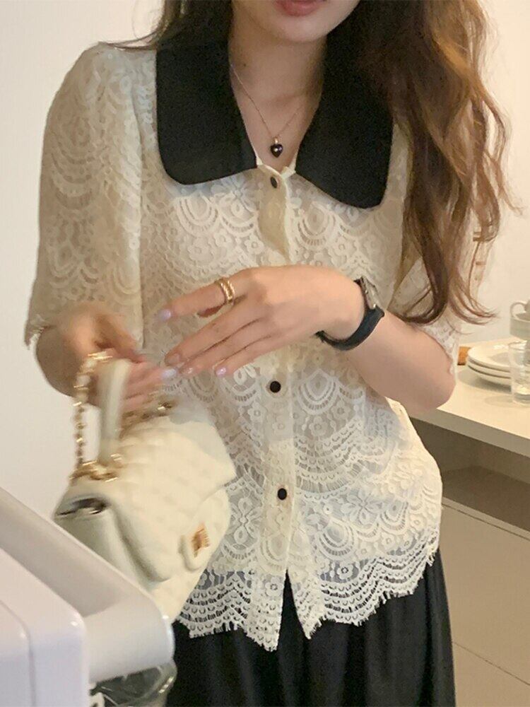 [EWQ] ピーターパン襟コントラストシャツレースフック花半袖ブラウストップ夏潮トップス 6Y8422 ショート ハーフスリーブ サマー 夏物 フラワーデザイン