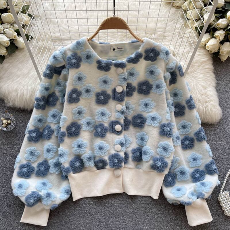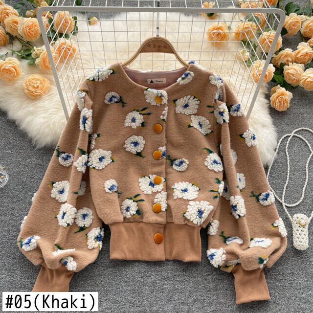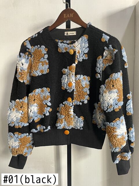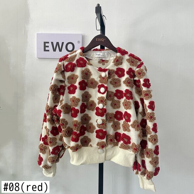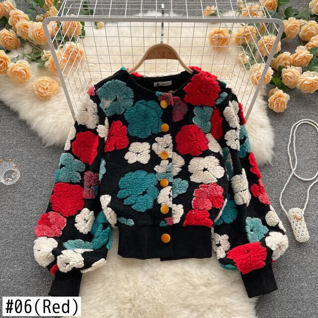 [EWQ] 立体フラワー バブルスリーブ Oネック フラシ天 暖かい トップス レディース レッド スウィートブルー ニットコート 春 大人ガーリー キュート カジュアル スプリング 春物 フラワーデザイン