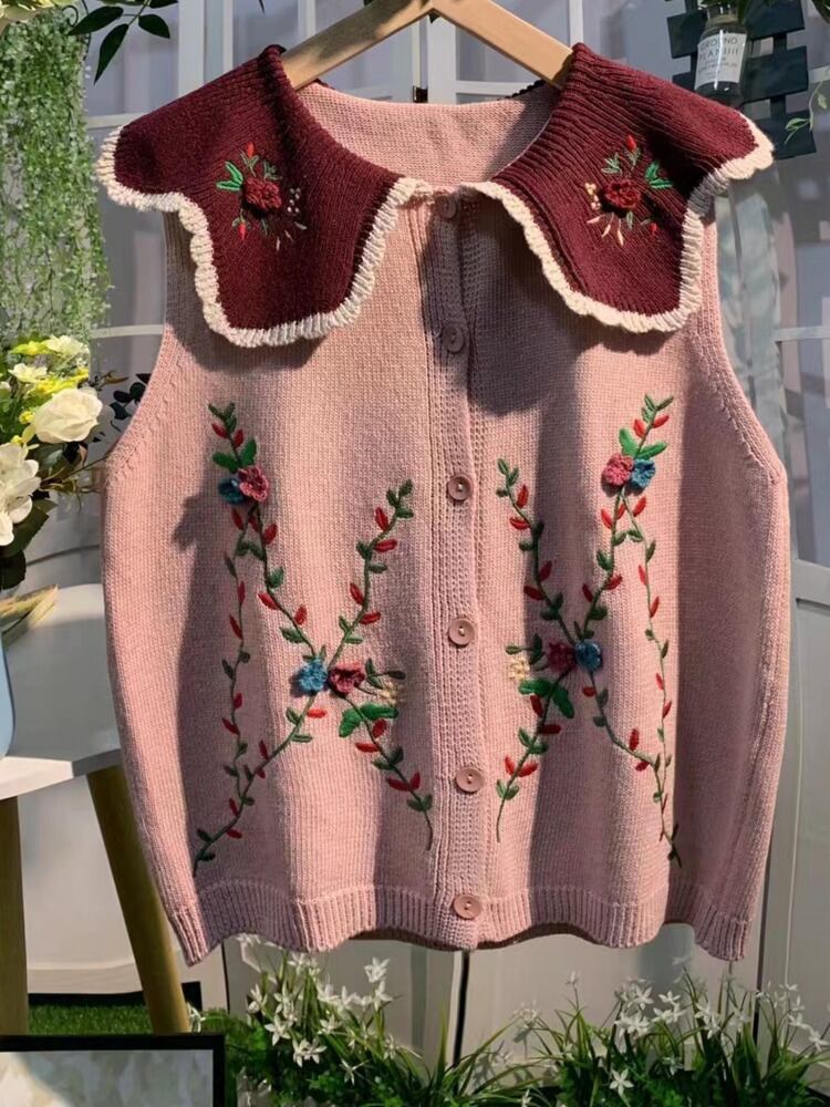 [EWQ] 甘いノースリーブ刺繍プリントスプライシングセーターベスト春秋潮ターンダウン襟ルーズオールマッチトップス 大人ガーリー スウィート キュート カジュアル スプリング 春物 オータム 秋物