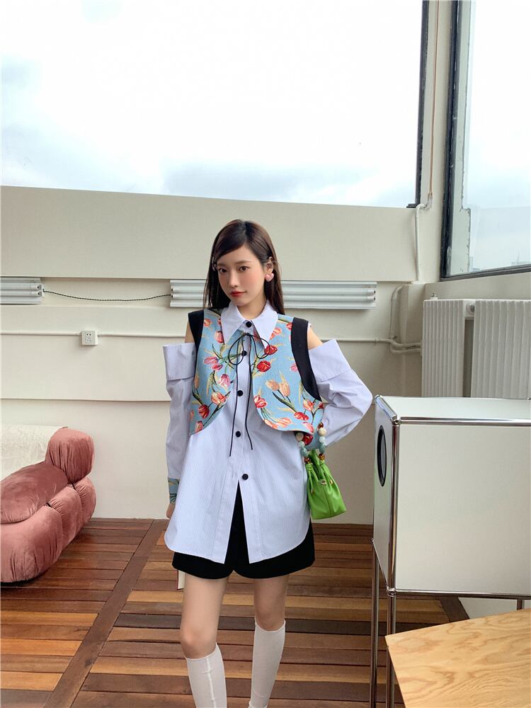 [EWQ]刺繍ベストツーピーススーツレディースストライプオフショルダーシャツ春秋フラワーコントラストブラウストップ スプリング 春物 オータム 秋物 フラワーデザイン