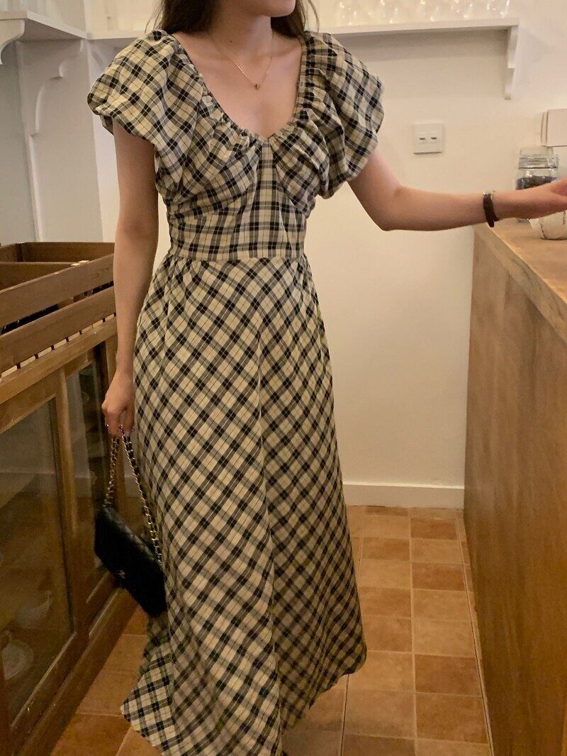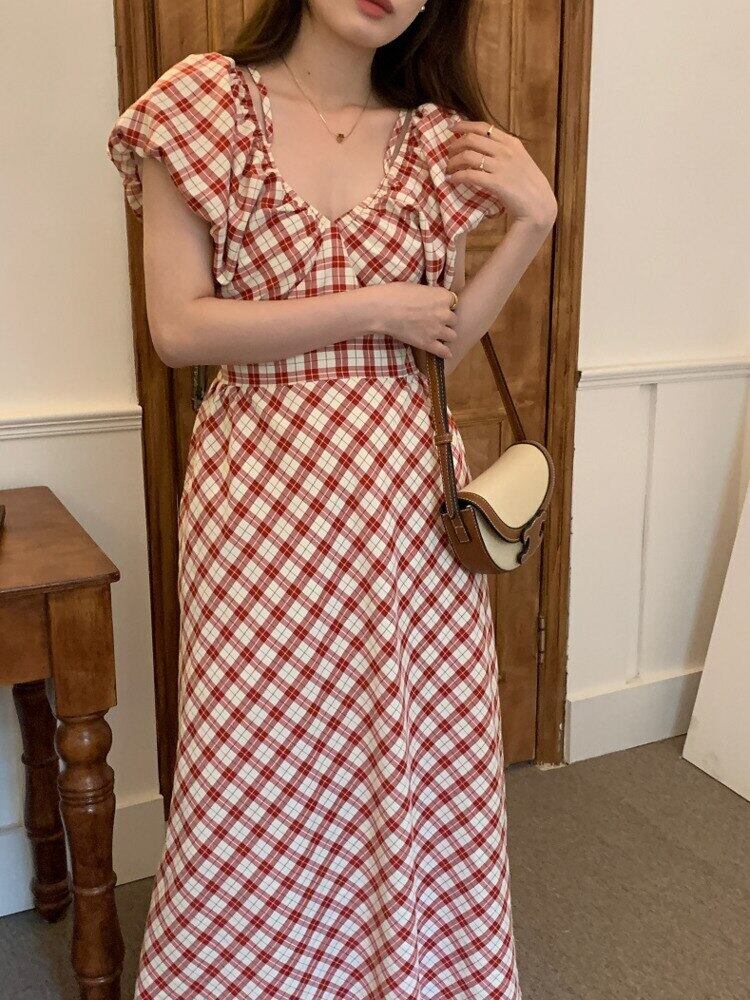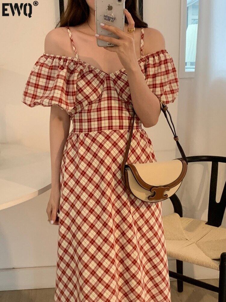[EWQ] レディース オフショルダー チェック ドレス コントラストカラー パフスリーブ ドレス サマータイド Vestido レッド 夏物