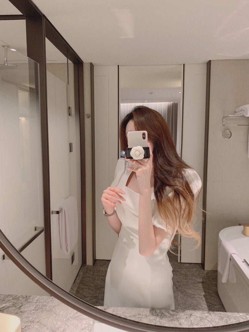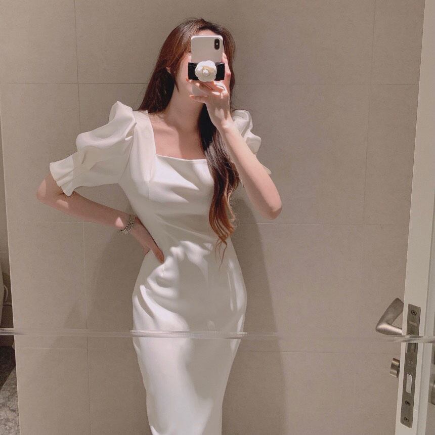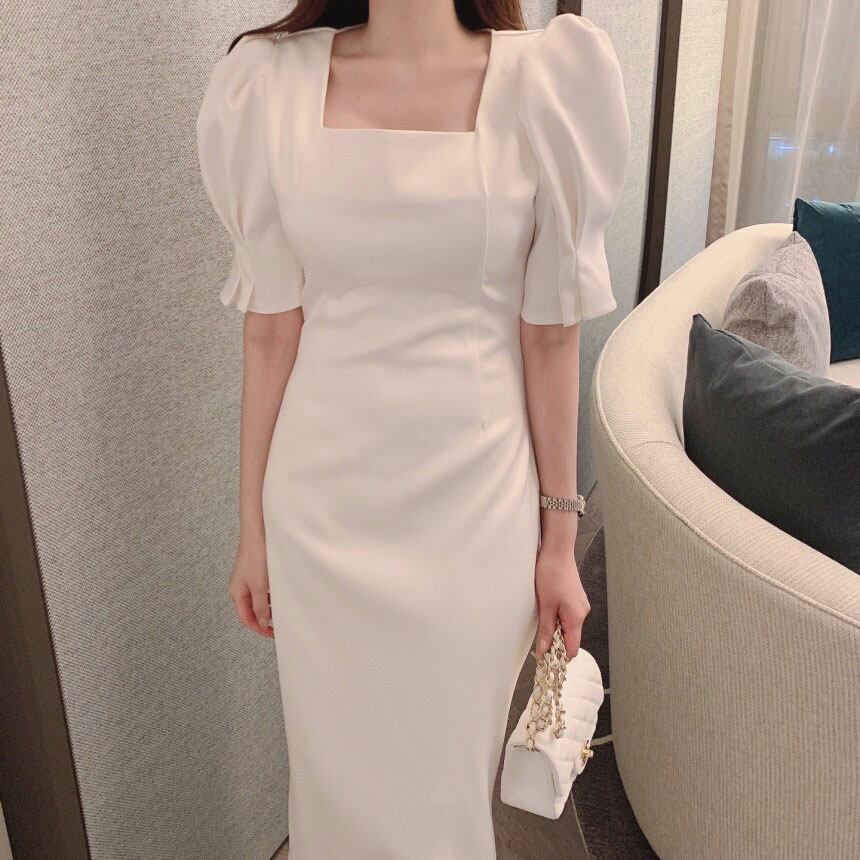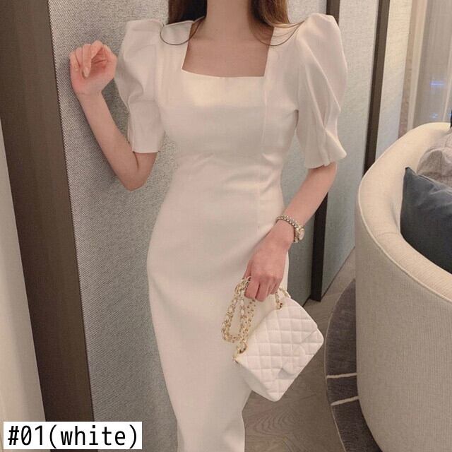 [EWQ] スクエアネックドレススリムパフスリーブ無地ドレス春夏 Vestido 16Y7020 スプリング 春物 サマー 夏物 ソリッドカラー スクウェア