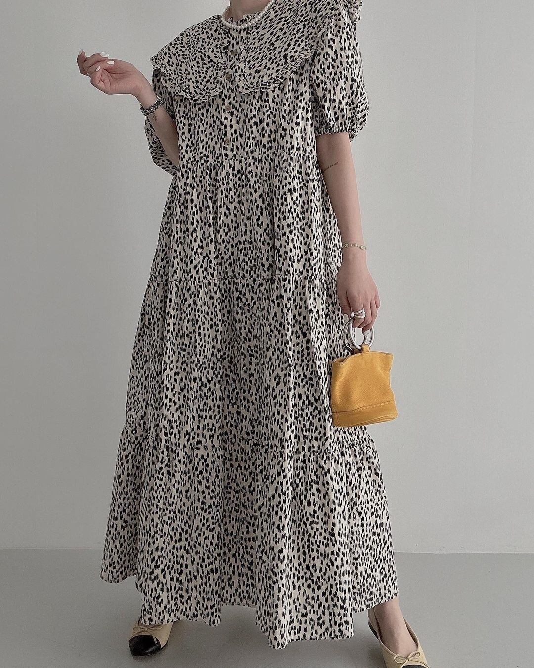 [EWQ] ヒョウ柄ルース ドレス特大バブル スリーブ ミディ ドレス夏潮コントラスト Vestido サマー 夏物