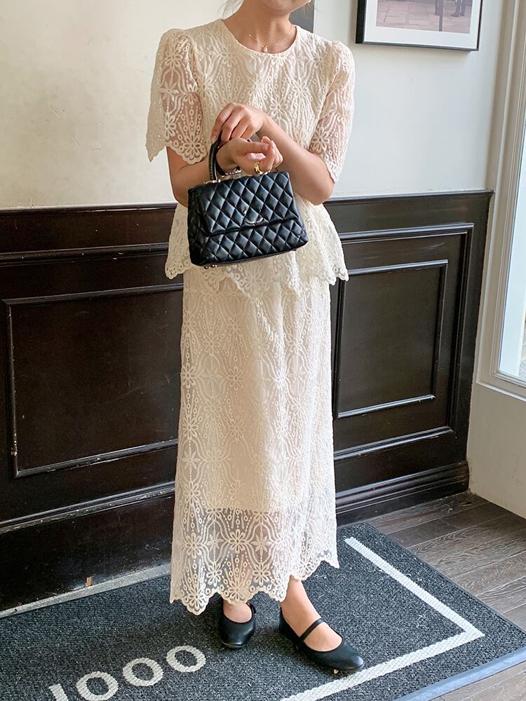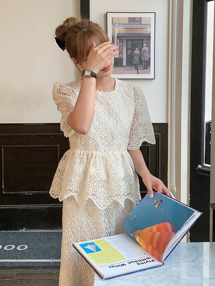 [EWQ] 半袖刺繍フリル シャツ + フック花 A ライン スカート ツーピース スーツ夏潮セット 7905 ショート ハーフスリーブ サマー 夏物 Aライン フラワーデザイン