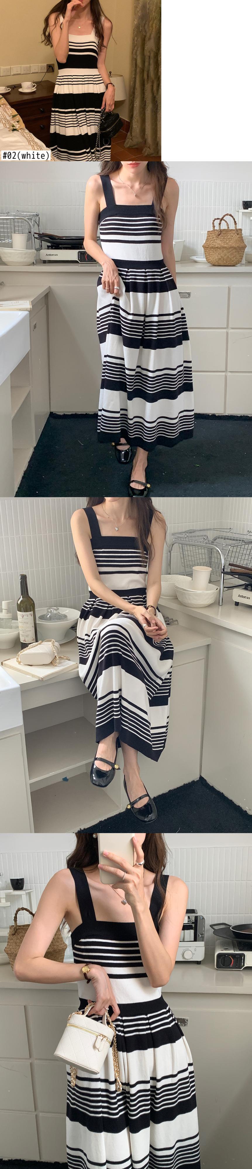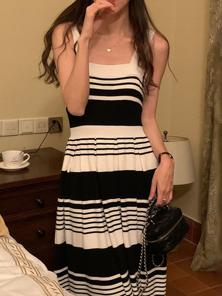 [EWQ] コントラスト ストライプ ジャカード ニット ドレススクエア ネック ノースリーブ弾性ドレス春夏 Vestido エラスティック 伸縮 スプリング 春物 サマー 夏物 スクウェア