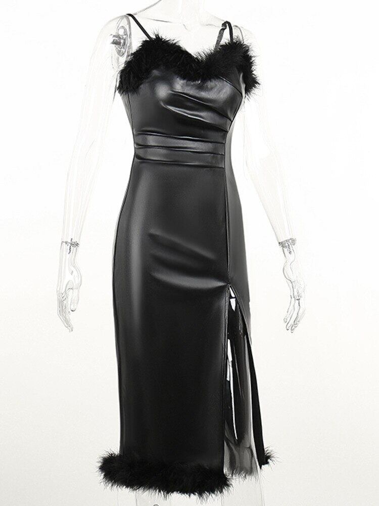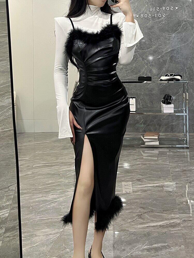 [EWQ] フェザー Tel レザー スリング ドレススプリット ノースリーブ PU ドレス春夏 Vestido Y6824 スプリング 春物 サマー 夏物